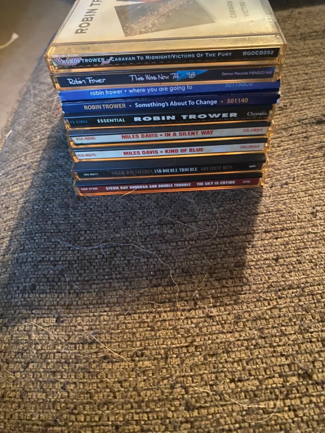 Selling a collection of CDs, including albums from Robin Trower and Miles Davis. Titles include 'Caravan To Midnight/Victims of the Fury,' 'This Was Now '74-'98,' 'Where You Are Going To,' 'Something's About To Change,' 'Essential Robin Trower,' 'In A Silent Way,' 'Kind of Blue,' 'Greatest Hits' by Stevie Ray Vaughan and Double Trouble, and 'The Sky Is Crying' also by Stevie Ray Vaughan and Double Trouble