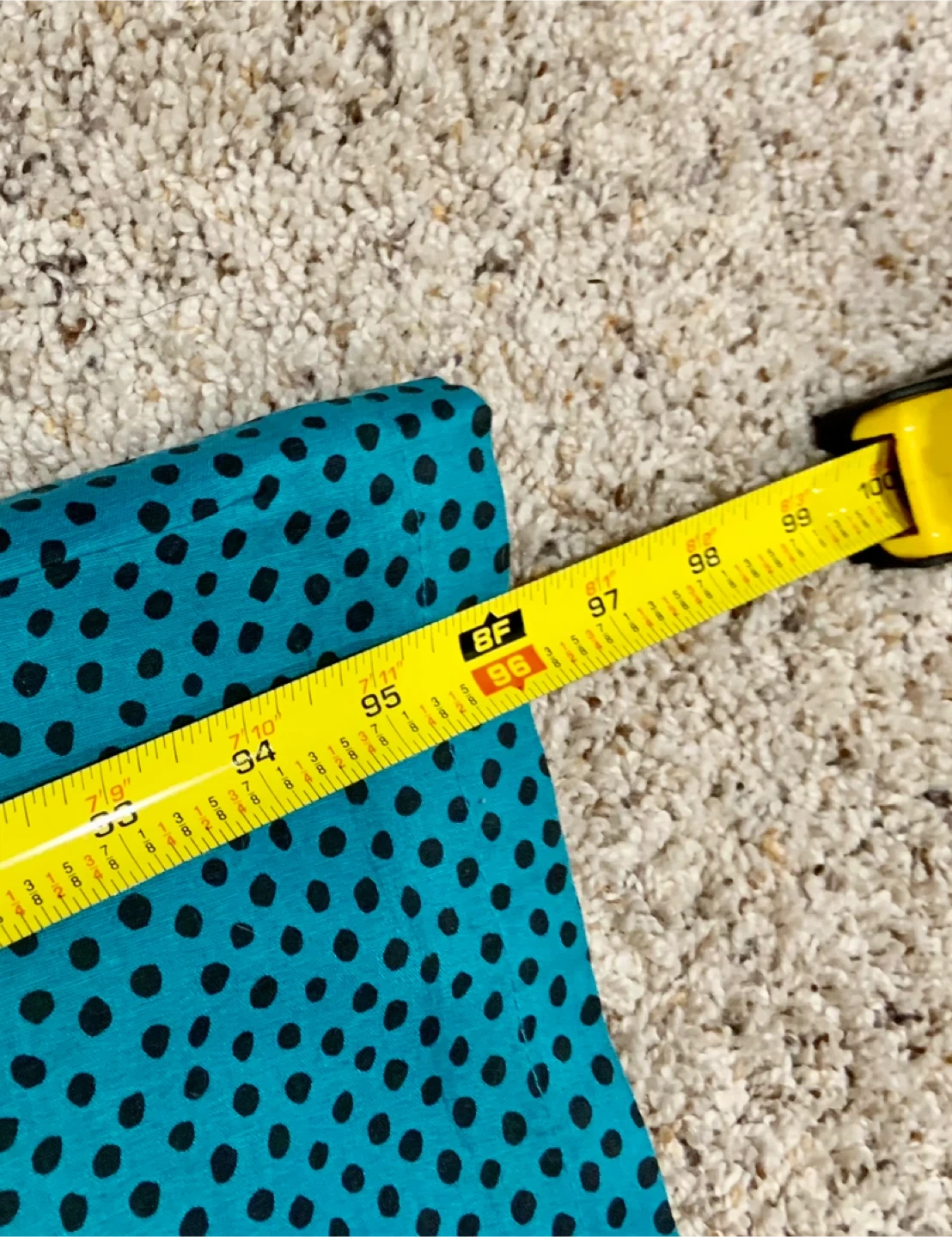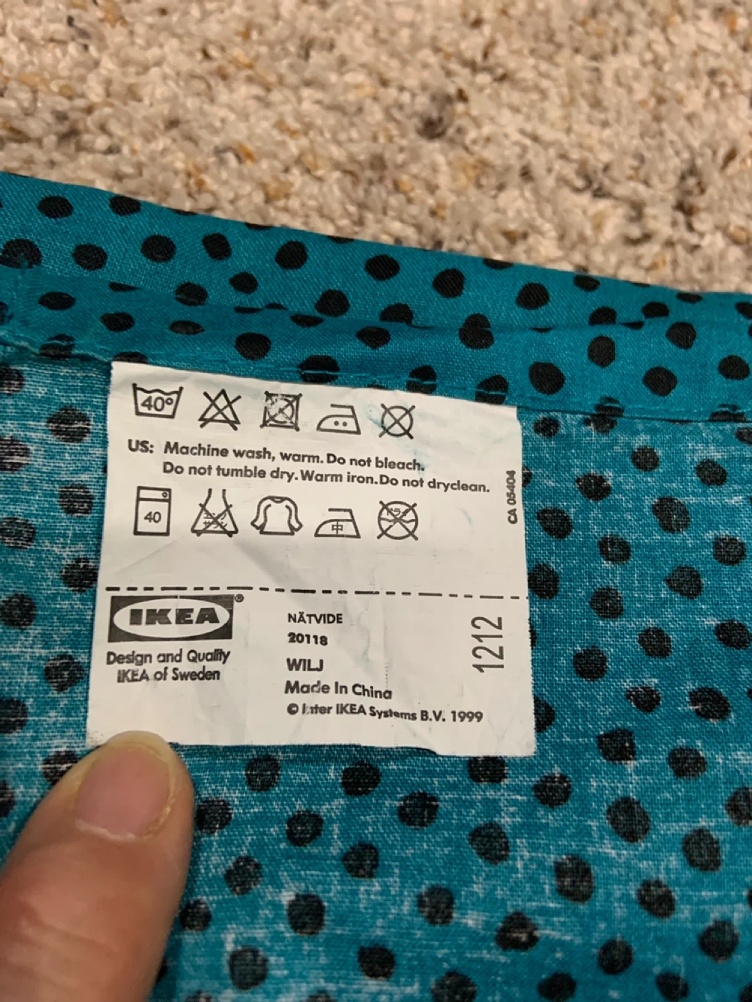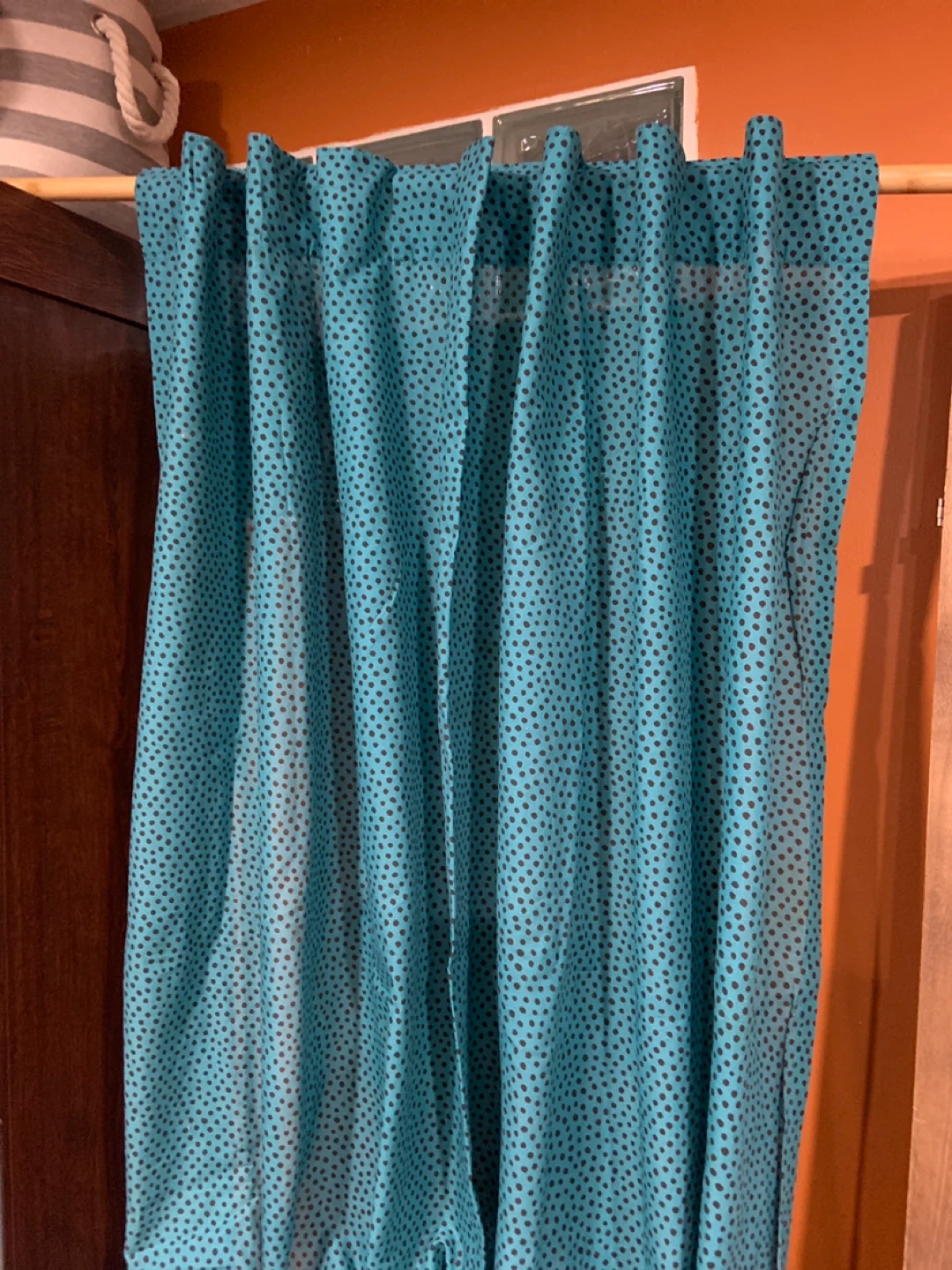 Selling TWO 💯 % cotton IKEA NÄTVIDE curtain panels in a lovely teal colour with black polka dots! It measures about 96” (8ft) in length. Can use pull backs to tie/bunch up length.