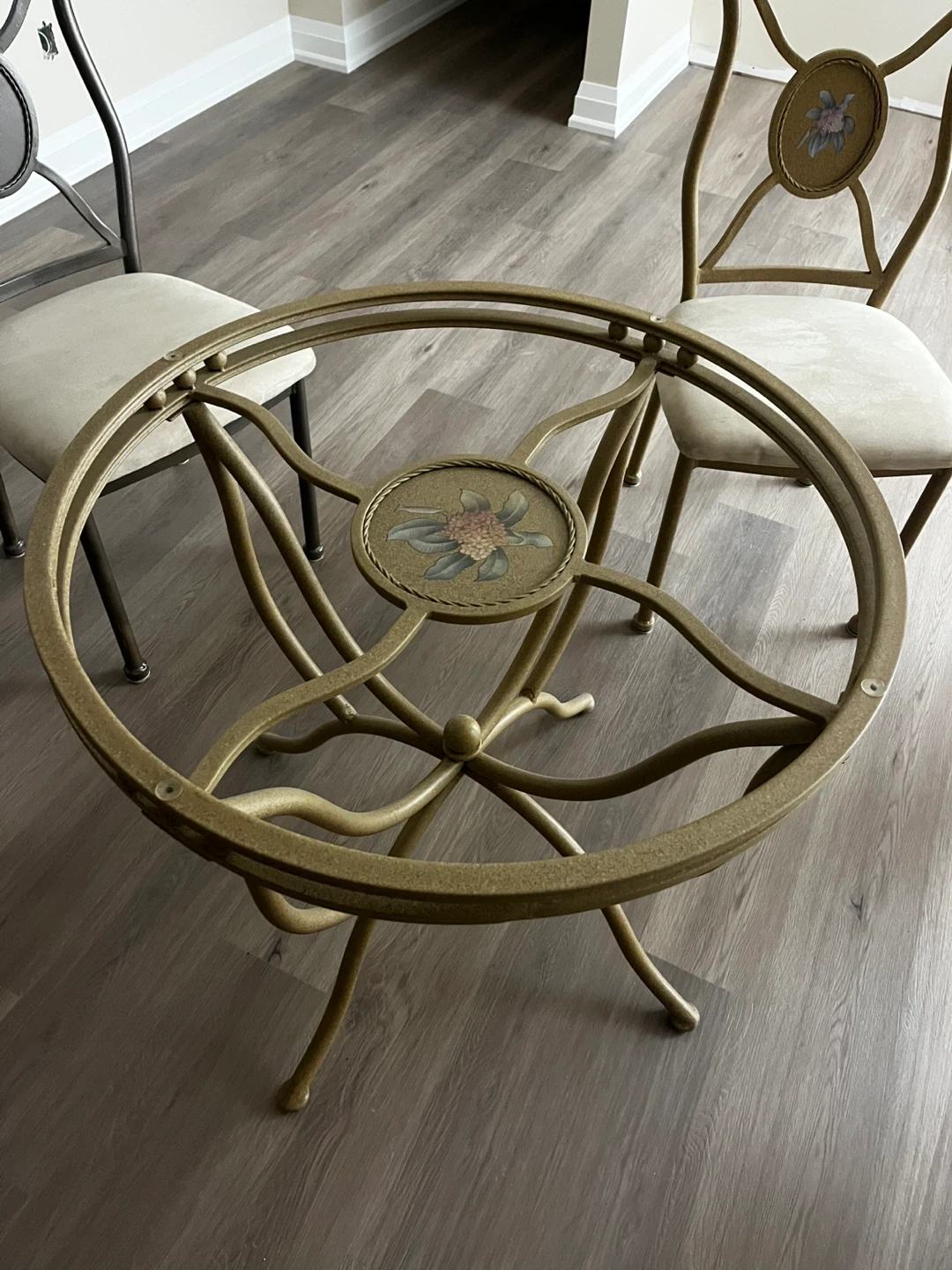 So we have two chairs spray painted and the rest are not (table and two chairs are not painted).