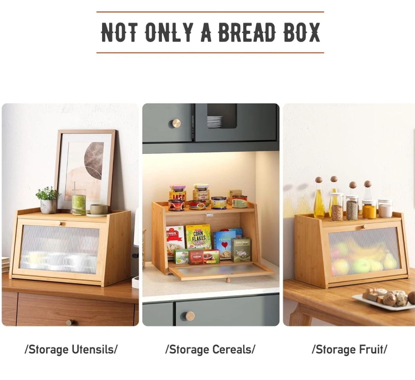 * Versatile Storage: With its spacious interior, this bread box can accommodate various sizes and types of bread, as well as other pantry items like pastries, bagels, and more.It can also store fruits, spices, bowls and other kitchen utensils.