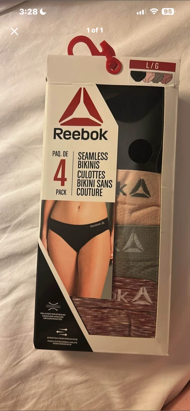 14Selling a brand new Reebok 4-pack of seamless bikini underwear in size L/G. The pack includes a variety of colours and features a relaxed waistband and stretch performance material. Never been opened!