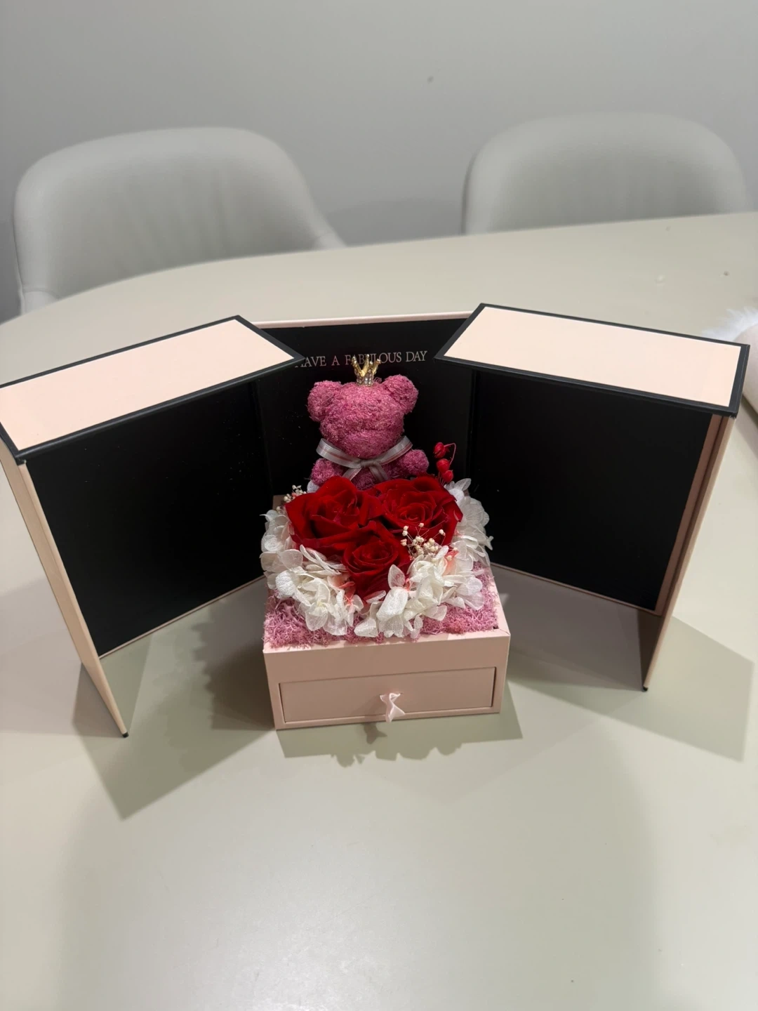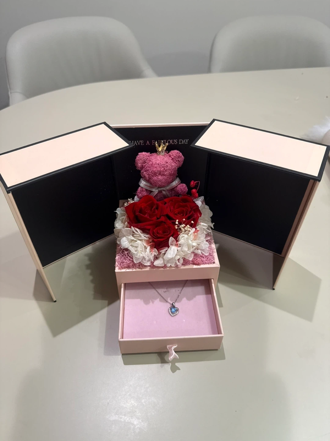 Real Preserved Flower Rose with 925 Sterling Silver Necklace, flashing led lights, magnetic ribbon bow tie, letter card. Complete set.