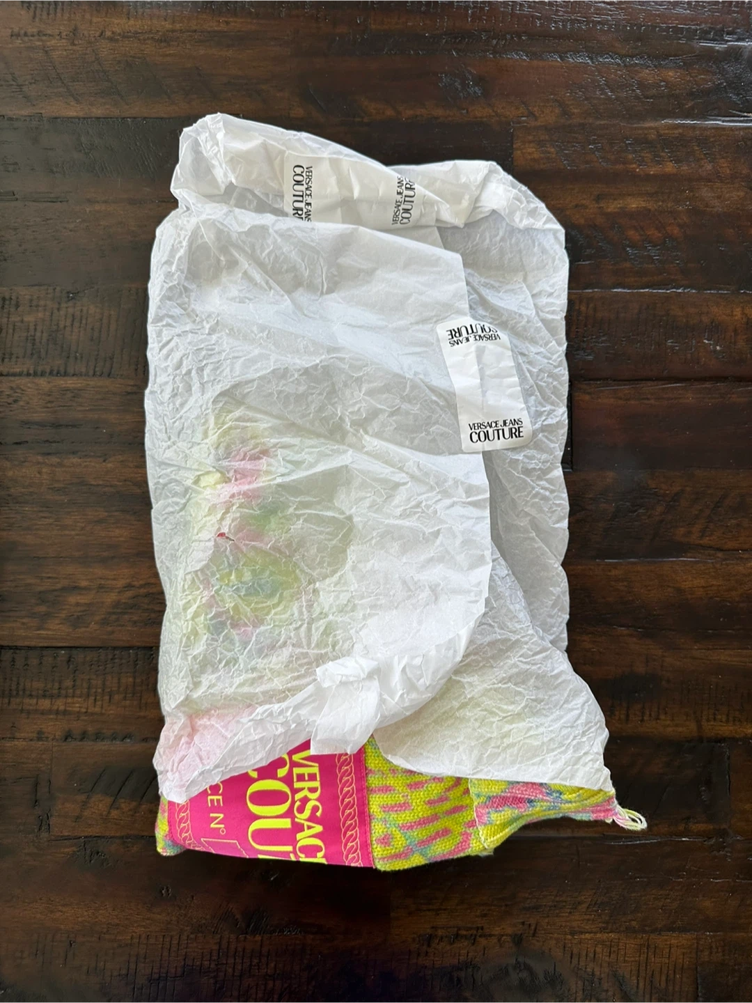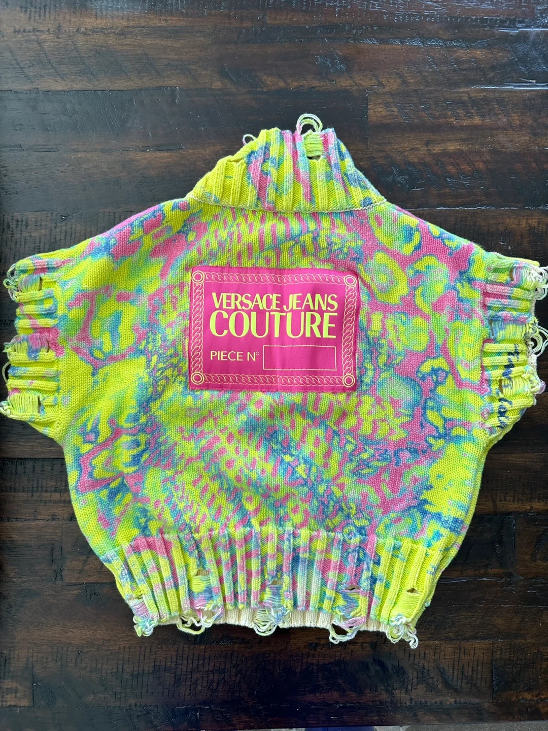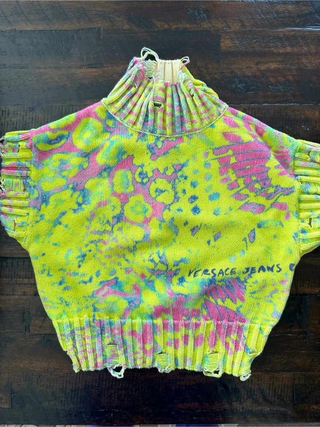 Selling a Versace Jeans Couture knit top. It features a unique design with a high neckline and distressed detailing. The top has a colourful pattern with yellow, pink, and blue hues. Perfect for adding a statement piece to your wardrobe!