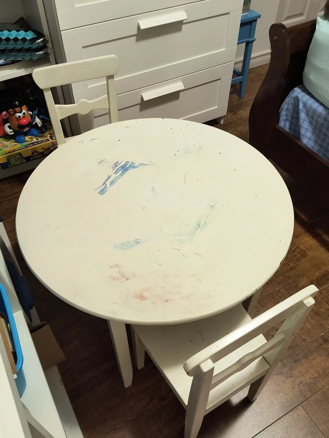 Selling a cute kids' white round table with chairs! It's perfect for arts and crafts, snack time, or just hanging out. There are some signs of use on the table top, as you can see in the pictures, but it's still got lots of life left in it for your little ones.
