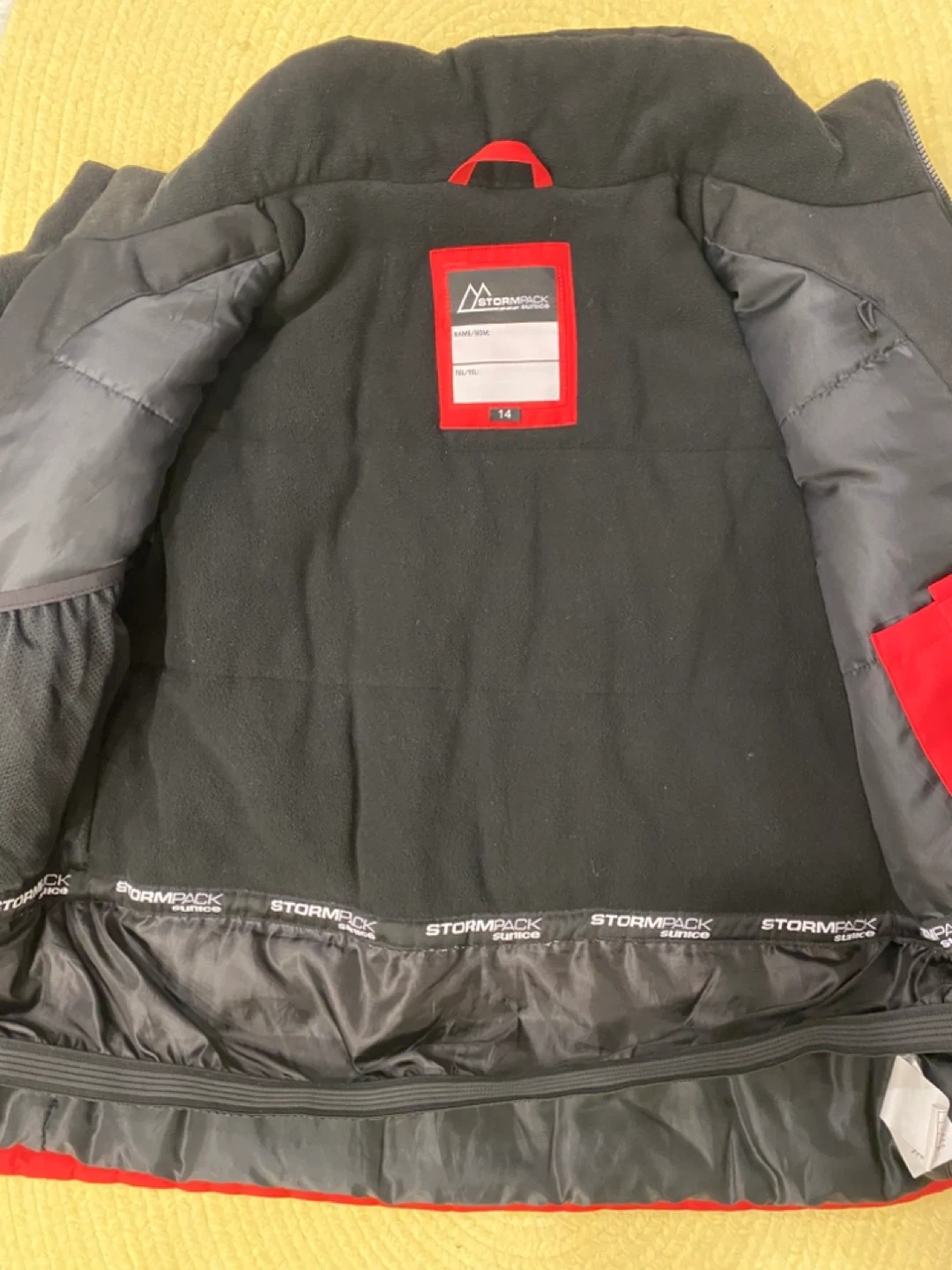 Selling a Stormpack kids' winter jacket in size 14. It's red and black, perfect for staying warm during the colder months! The jacket is in great condition and ready for a new home. This size is for a child between 10 and 12 years old