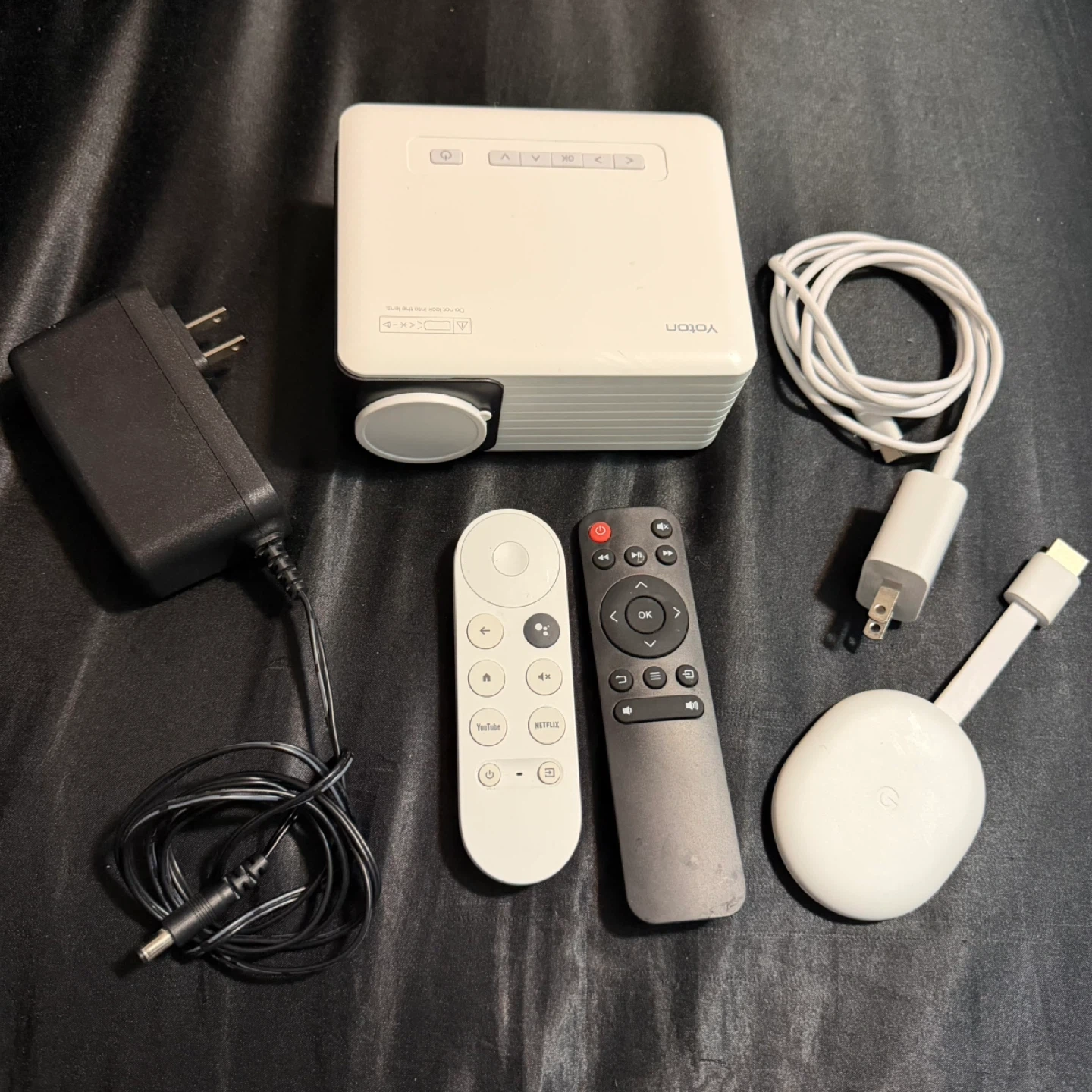 Selling a Yoton projector that's in great shape! It comes with all the accessories you see in the pictures, including the power adapter, remote, and a Google Chromecast with remote. Perfect for movie nights or presentations!