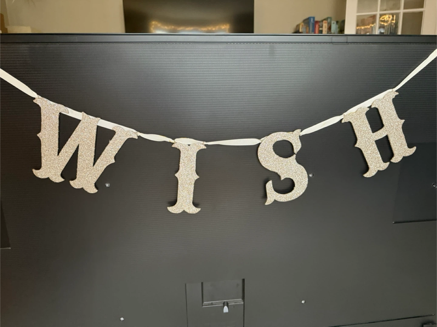 Hanging on a white ribbon and fastened in place so the letters don’t move around. In excellent condition; from a pet-free smoke-free home