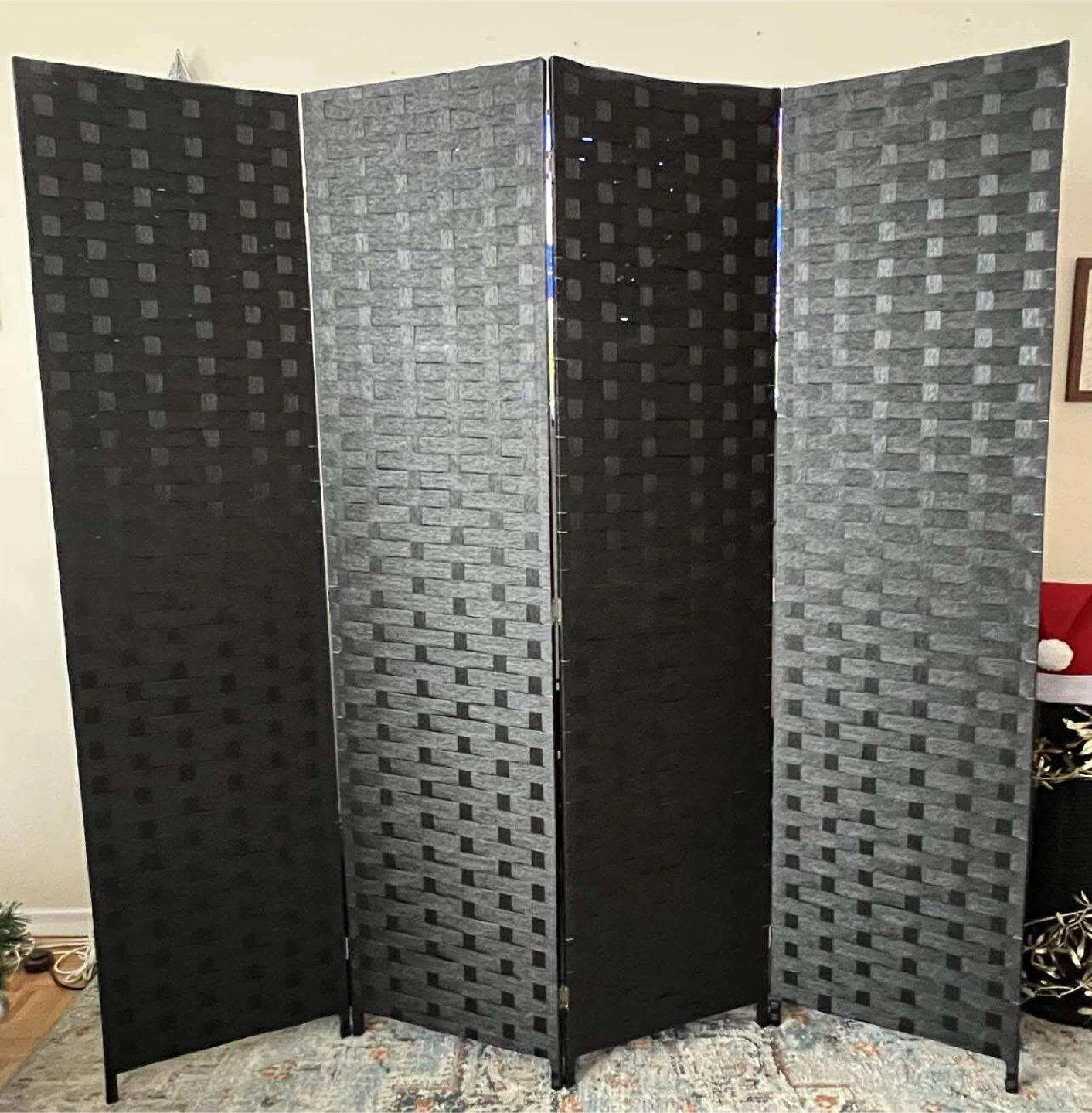 Selling a four-panel folding room divider in a stylish grey and black colour scheme. It's perfect for creating privacy or dividing a room. The screen is in good condition and ready to use in your home!