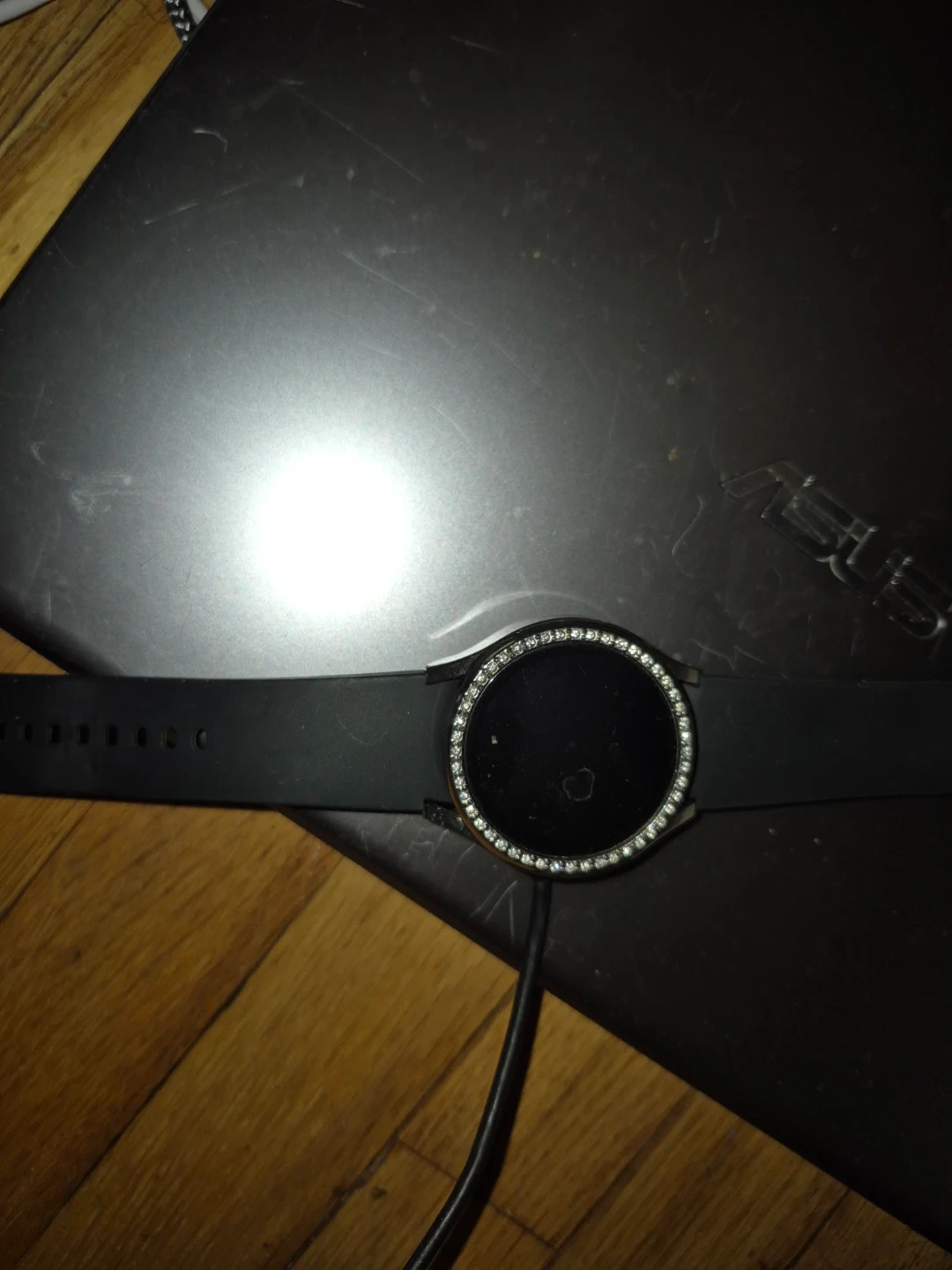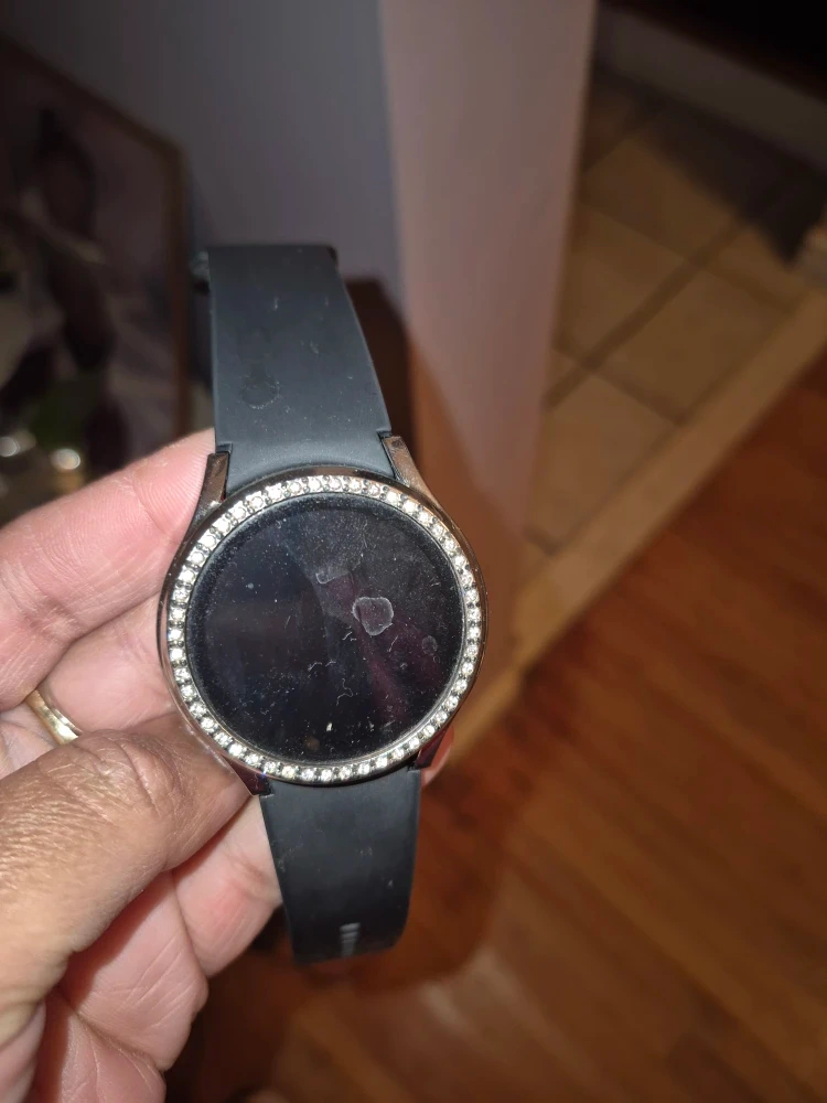 Selling a smart watch with a black band and a rhinestone bezel! It's in good condition