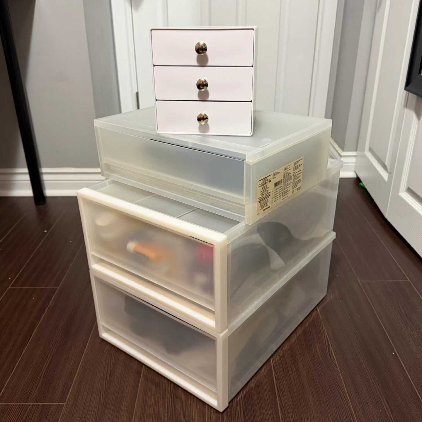 Selling a few storage solutions from Muji! There's a small white cabinet with three drawers and two larger PP storage drawers bigger size, one with drawer medium size and a small one with three (non muji). Great for organizing your space!
