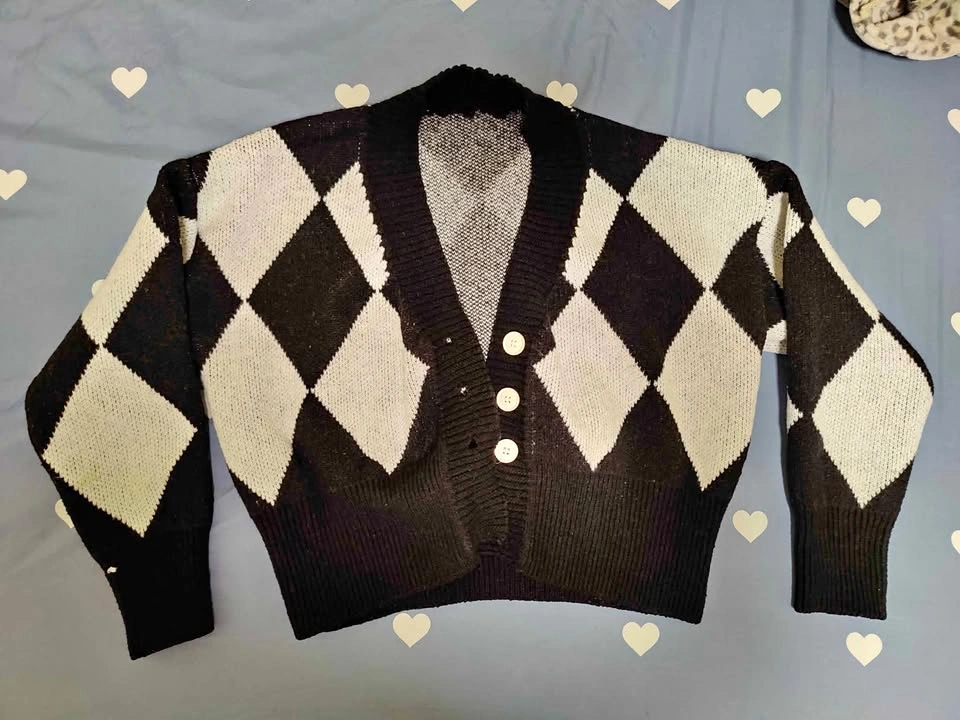 Comfy black-and-white checkered cardigan. Thick knit and great for layering. Fair condition but still looks nice on!