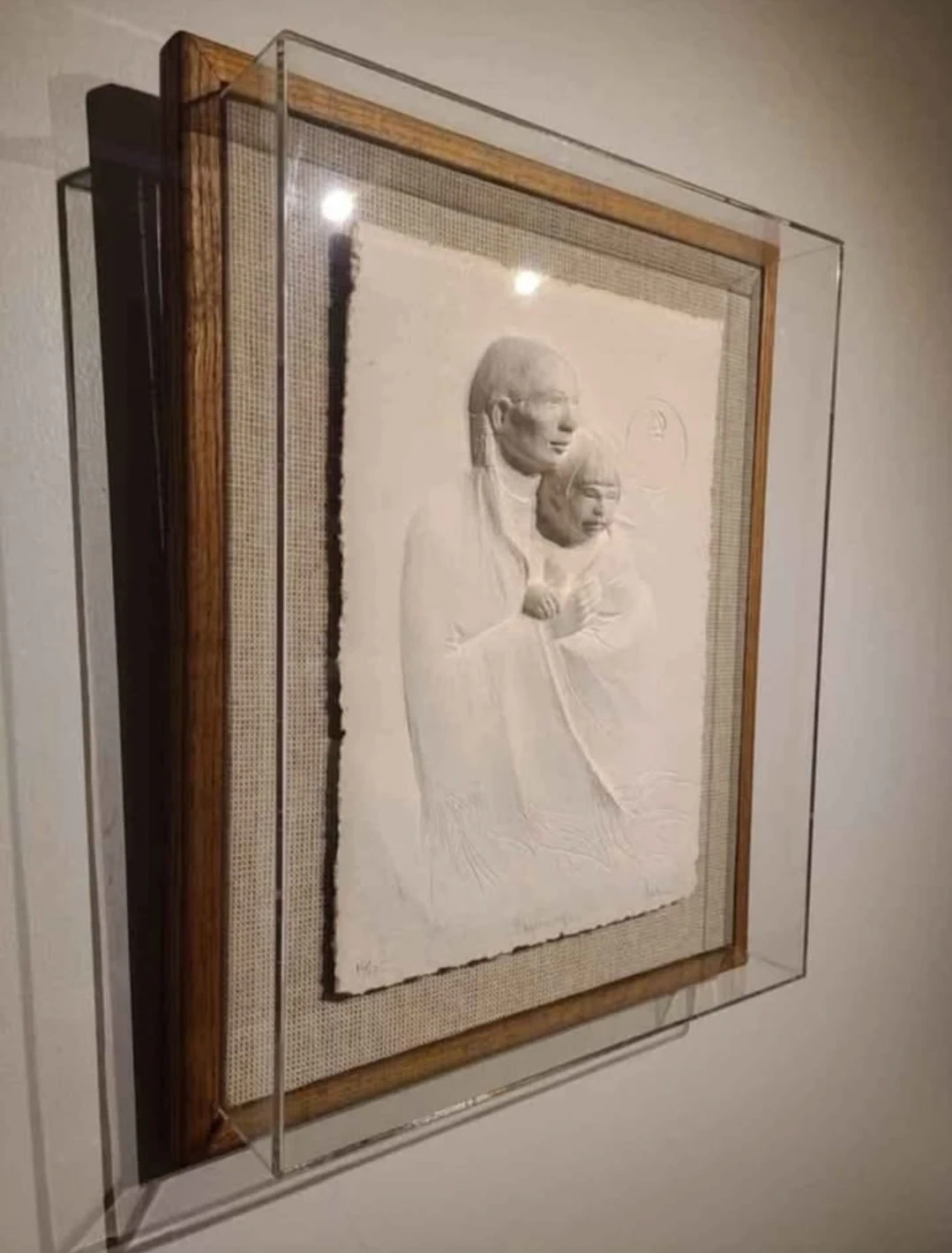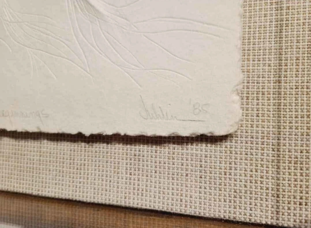 This striking 1985 pressed paper sculptural relief, *Beginnings*, by American artist Jean Juhlin, showcases her mastery of texture and form. Numbered 16/175, it is signed, titled, and dated in pencil along the lower margin. The piece remains in very good condition with Lucite box frame being in excellent condition (commonly heavily scratched!)
