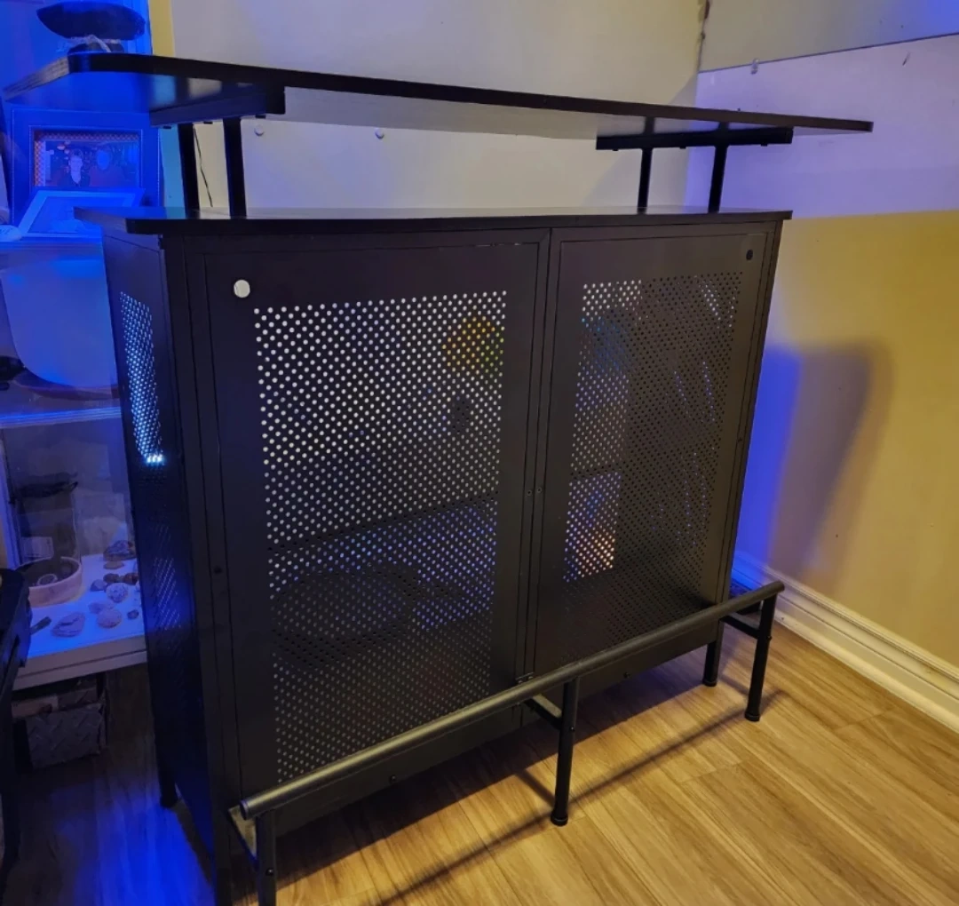 Selling a black bar cabinet in perfect condition. It features shelving, a wine glass rack, and a countertop surface. Great for storing your favourite drinks and glassware!