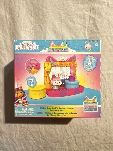 Gabby’s Dollhouse, Baby Box Talent Show Balcony Playset, 8-Pcs with Toy Figures, Doll House Accessories & Sensory Play, Kids Toys for Girls & Boys 3+Gabby's Dollhouse Baby Box Cat's Talent Show Balcony Set.