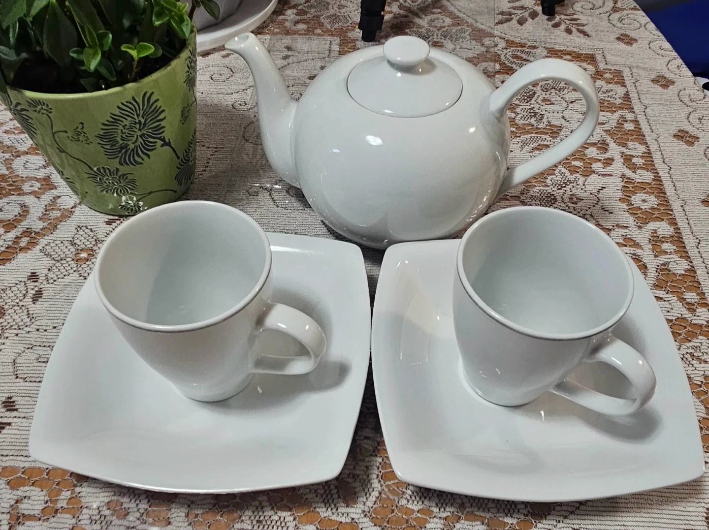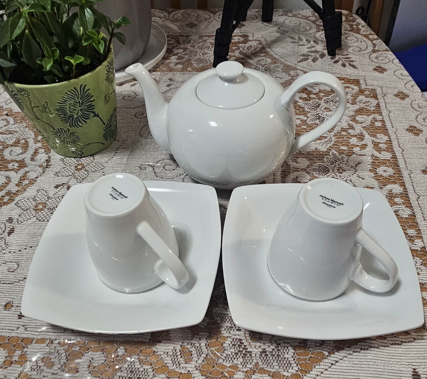 Selling a Joshua Maxwell Studio teapot set! It includes a teapot and two cups with square saucers. Perfect for tea time!