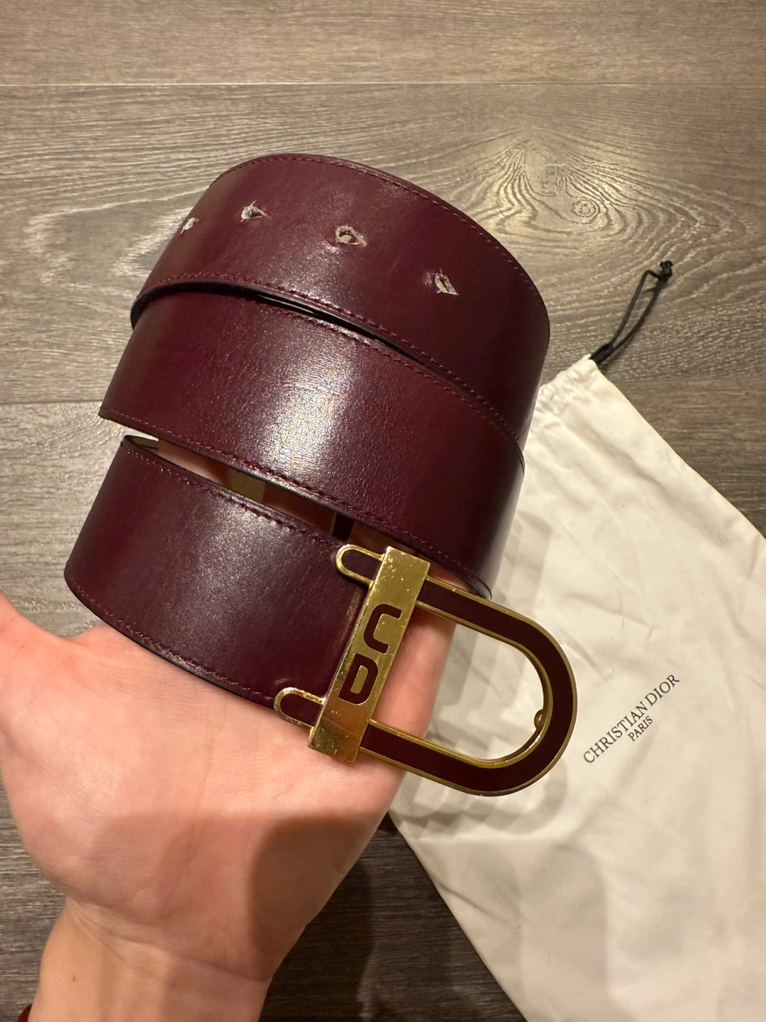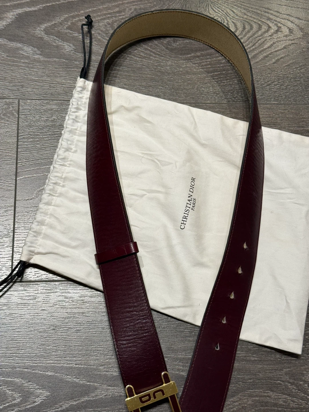 It's a size 85 and has a gold-tone buckle with a burgundy leather strap. Comes with the dust bag!