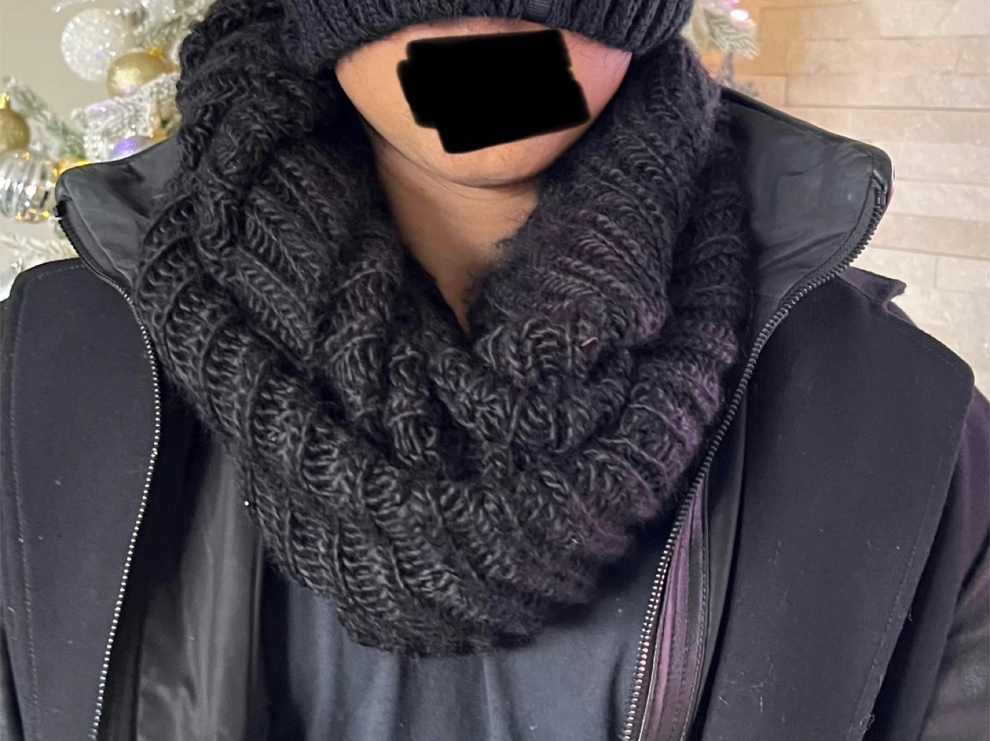 Cozy black knit infinity scarf for men’s H&M! It's a one-size-fits-all, perfect for adding a touch of warmth and style to any outfit during the colder months. The knit pattern adds a nice texture, making it a versatile accessory for your wardrobe