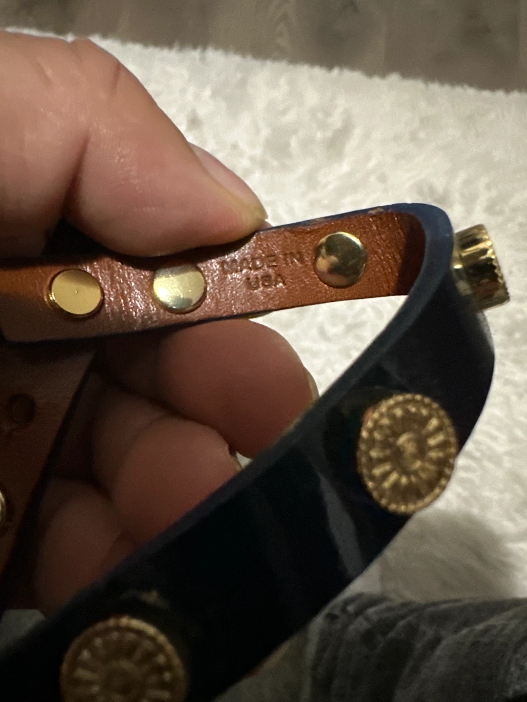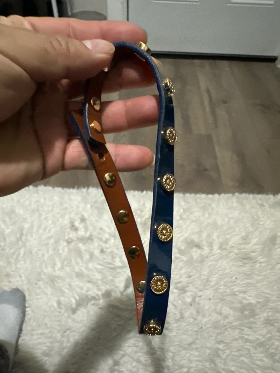 I'm offering a leather bracelet in a stylish blue and brown color combination. It features gold-tone hardware and a snap closure. This bracelet is in good condition and would make a great addition to any outfit!
