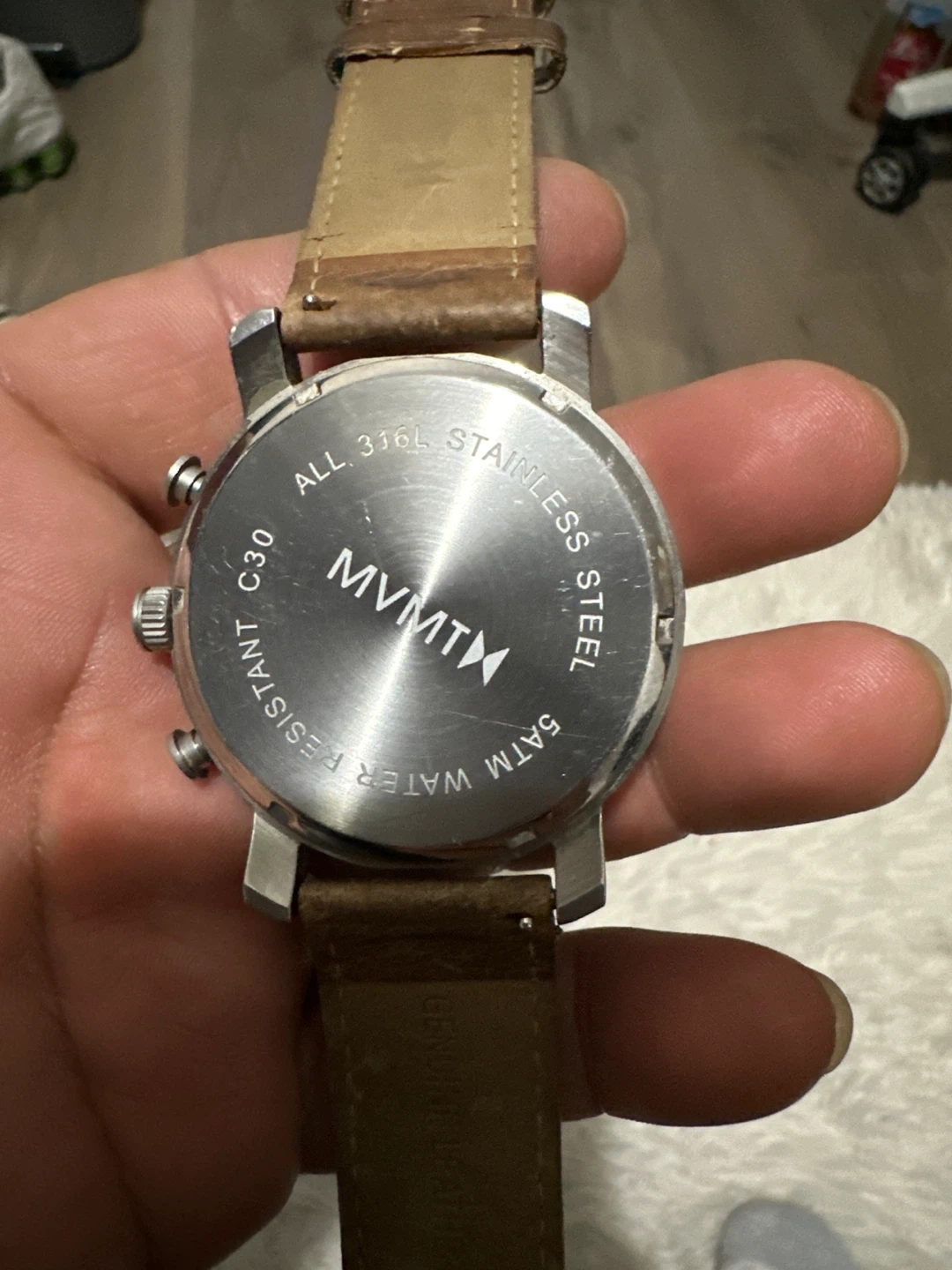 Selling a MVMT C30 watch. It features a stainless steel case and a genuine leather strap. The watch is water resistant up to 5ATM.