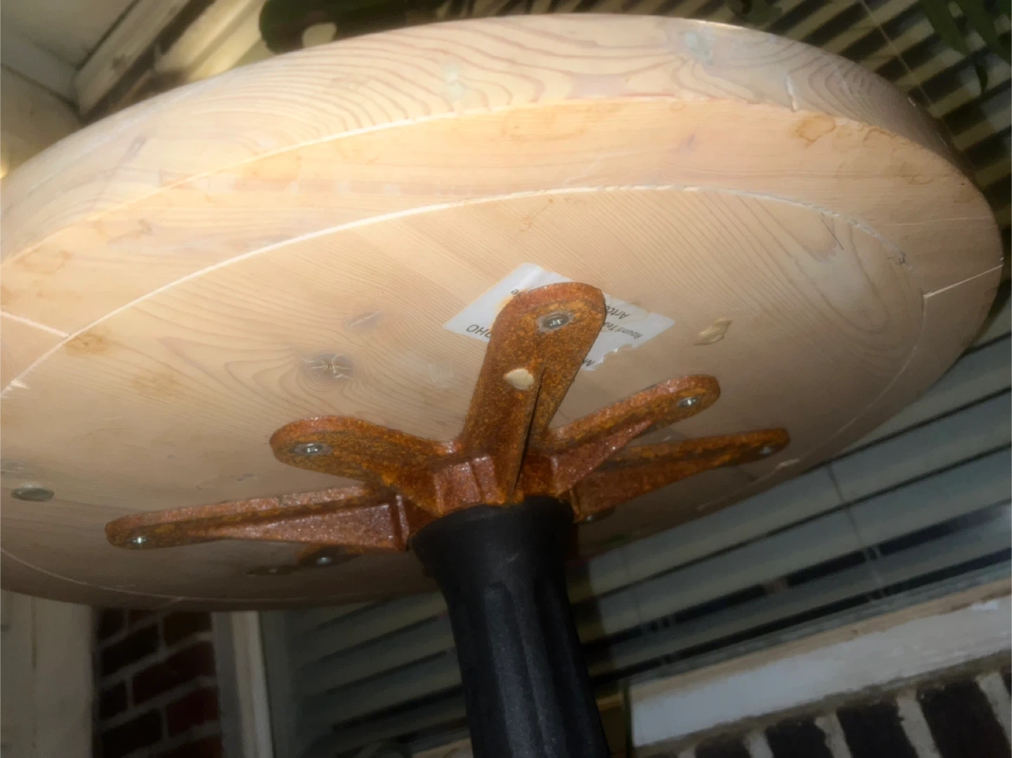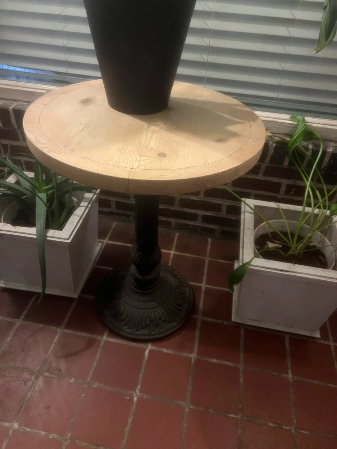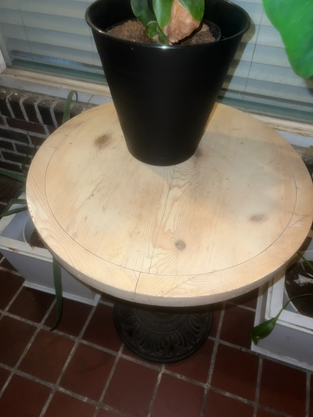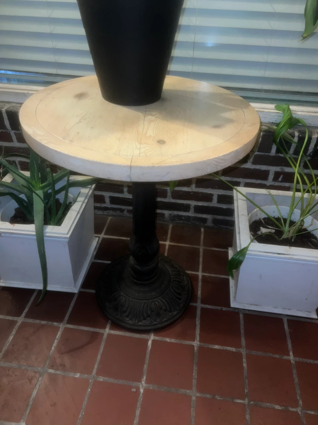 Selling a round wooden table with a black metal base. It's a nice accent piece for any room. The table has a light-colored wooden top and a decorative black metal base. It's sturdy and in good condition, ready to add some charm to your space!