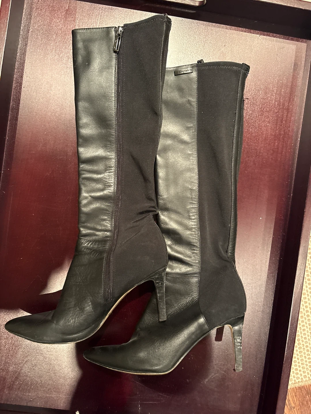 Selling a pair of Calvin Klein knee-high boots in black. They feature a stylish design with a combination of leather and elastic fabric. There are some signs of wear on the heels.