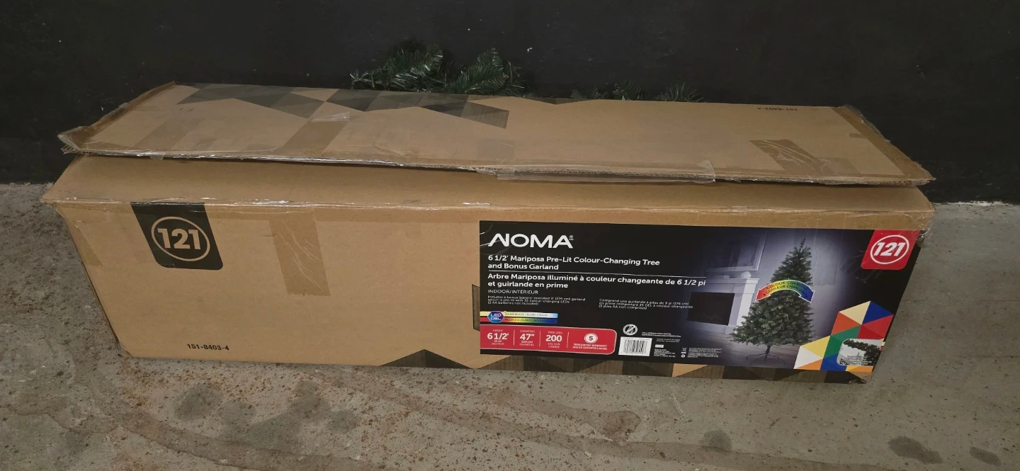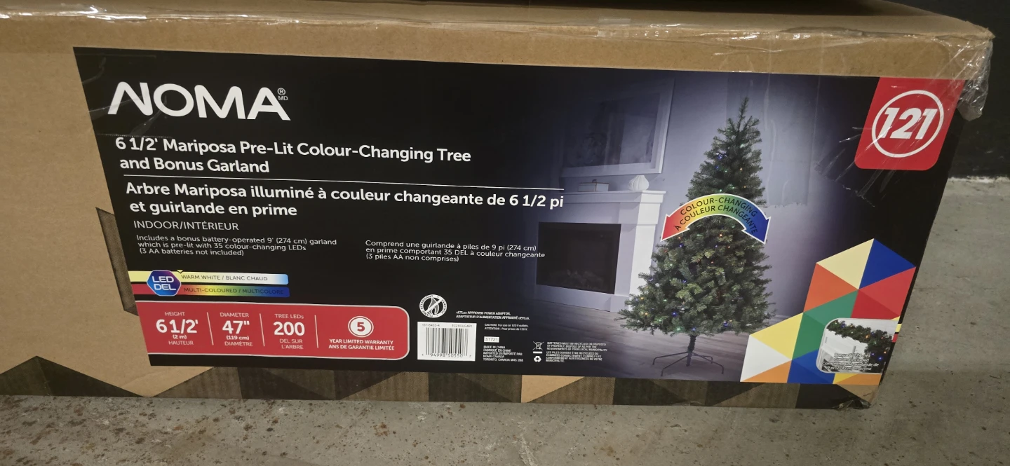 Selling a NOMA 6 1/2' Mariposa Pre-Lit Colour-Changing Tree and Bonus Garland. It's in great shape and comes with the original box. This tree also includes a bonus battery-operated 9' (274 cm) garland which is pre-lit with 35 colour-changing LEDs (3 AA batteries not included).