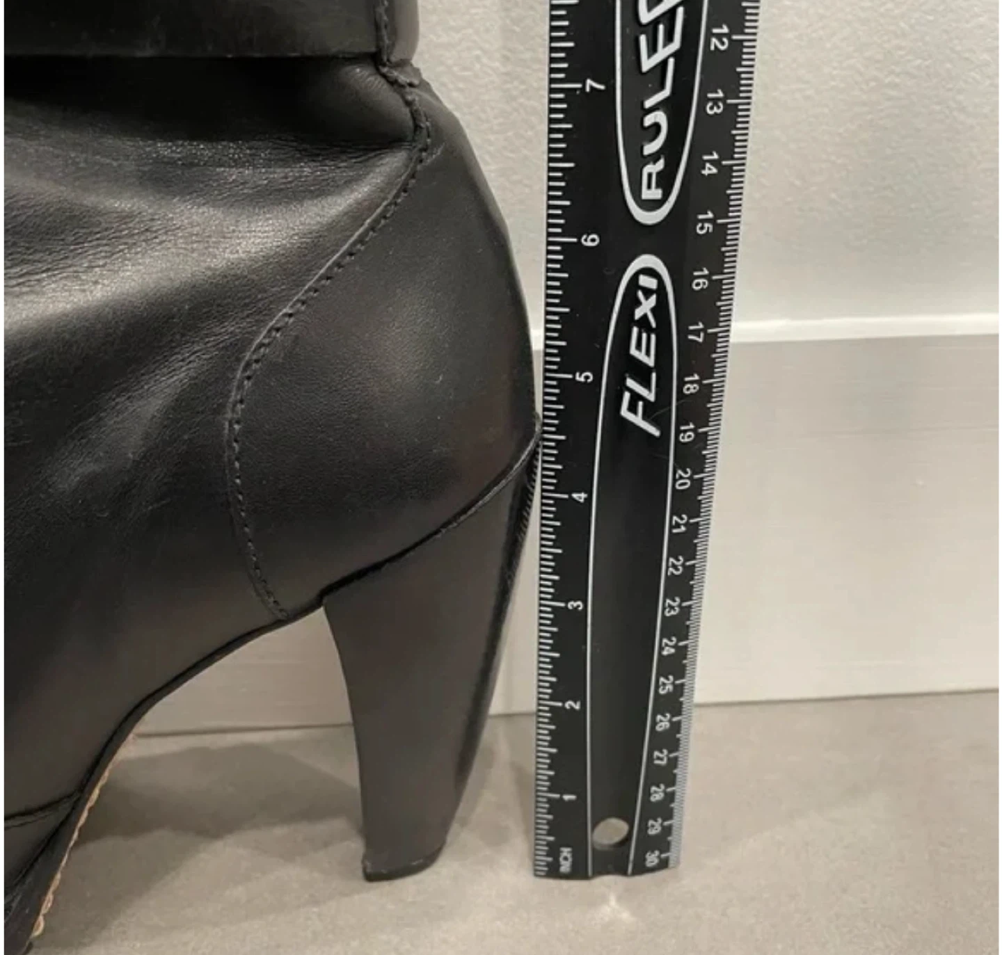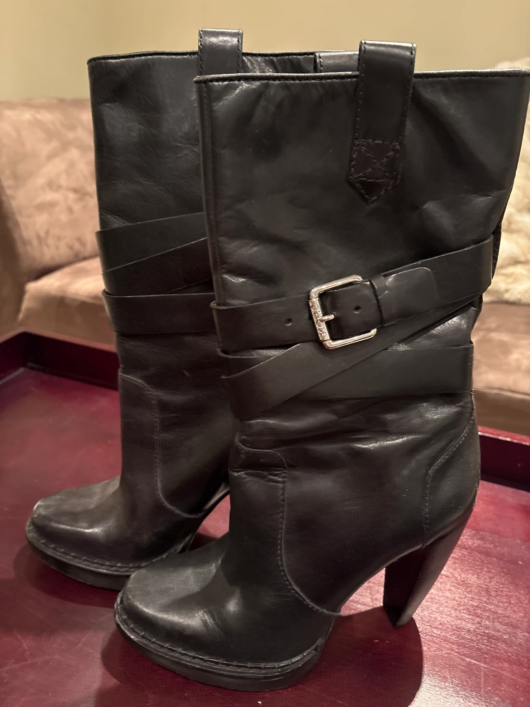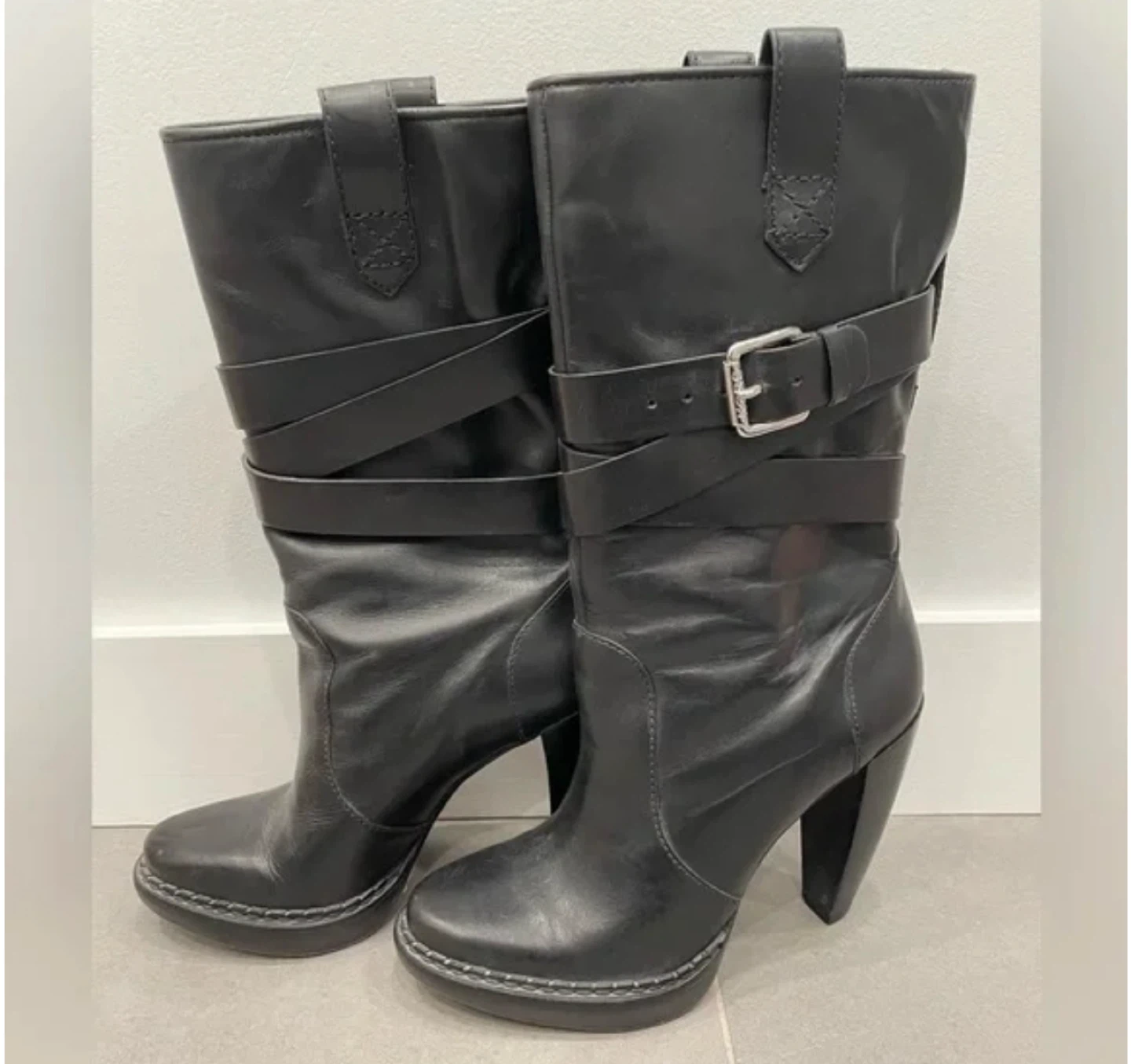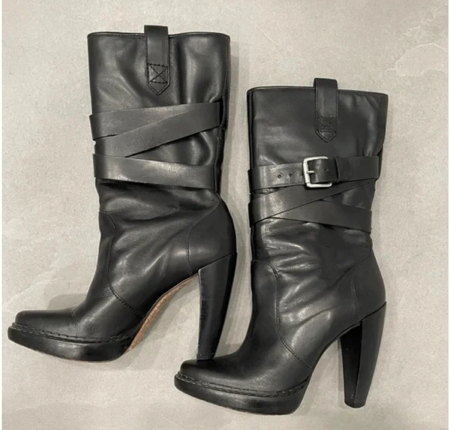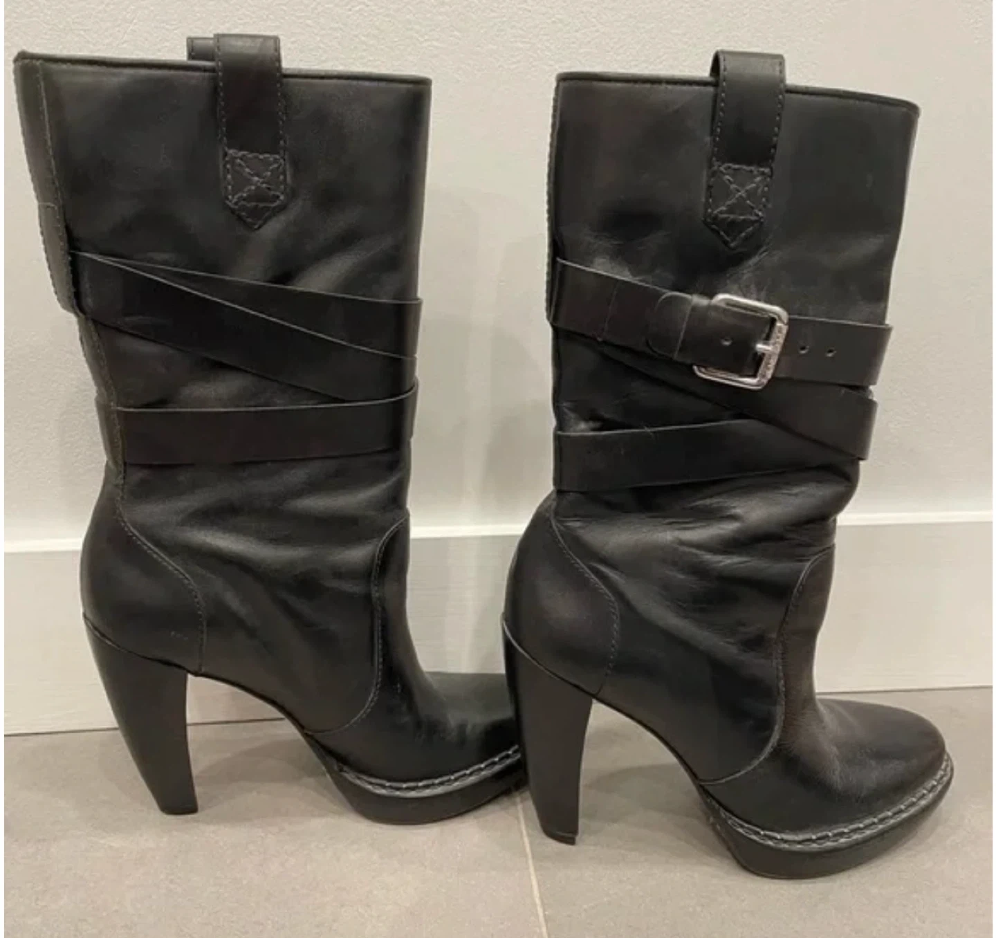 These are a stylish pair of black leather heeled mid-calf boots, perfect for adding a bit of edge to your outfit! They're a size 7 and feature a cool buckle detail. These boots are made of leather and are in good condition.