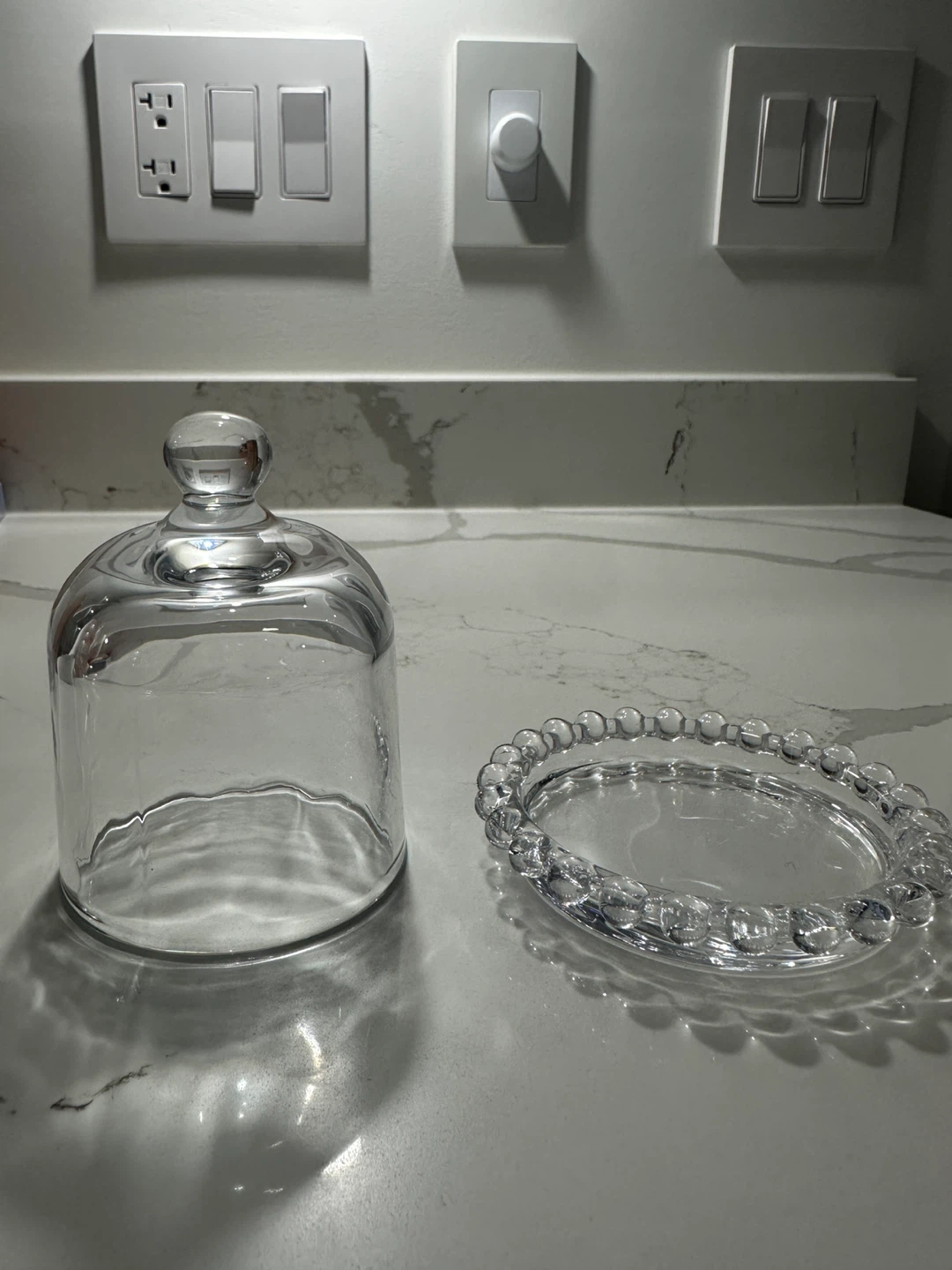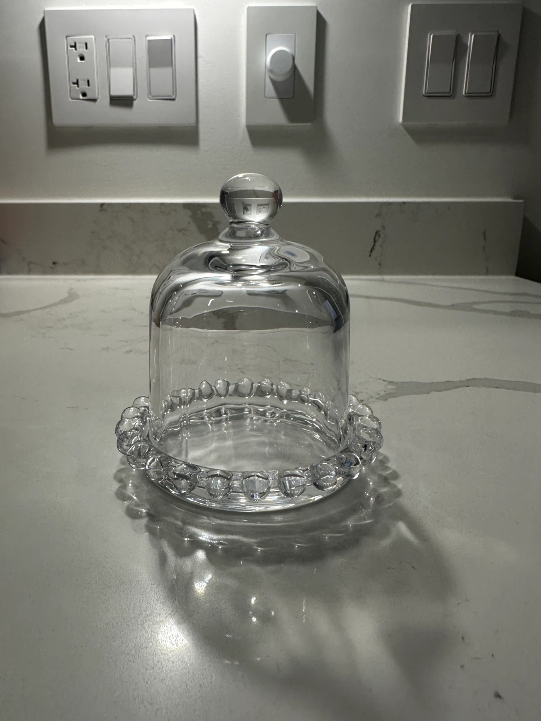 Selling a lovely glass cloche with a beaded edge! It's perfect for displaying baked goods or other small items. It's in great condition and ready for a new home
