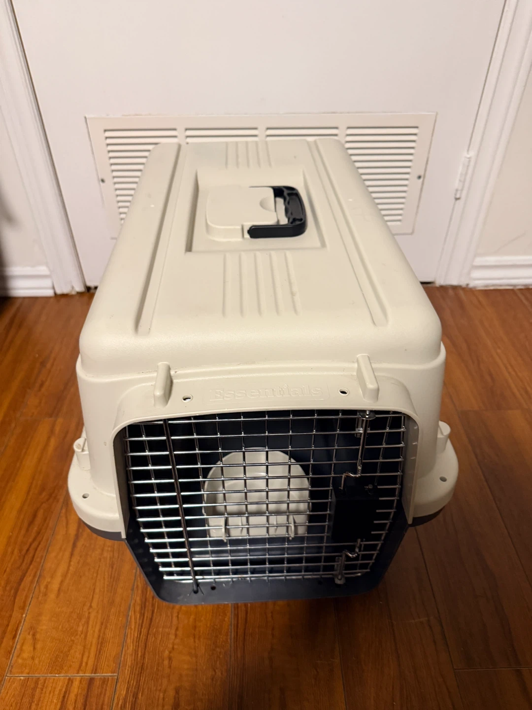Selling an Essentials pet carrier in good condition. It features a sturdy design and is perfect for transporting your furry friend safely and comfortably. It comes with a metal gate and a small bowl.