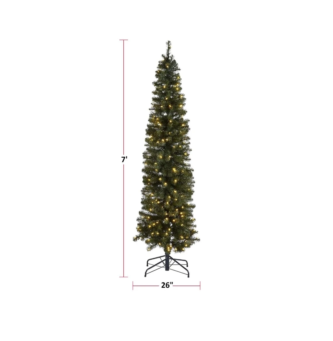 Selling a NOMA 7' Boulevard Pencil Tree. It's an indoor/outdoor tree with 200 warm white LED lights. The tree is 7' tall and 26" in diameter. It also includes a foot pedal to easily turn the lights on/off and has 408 branch tips. Comes in its original box