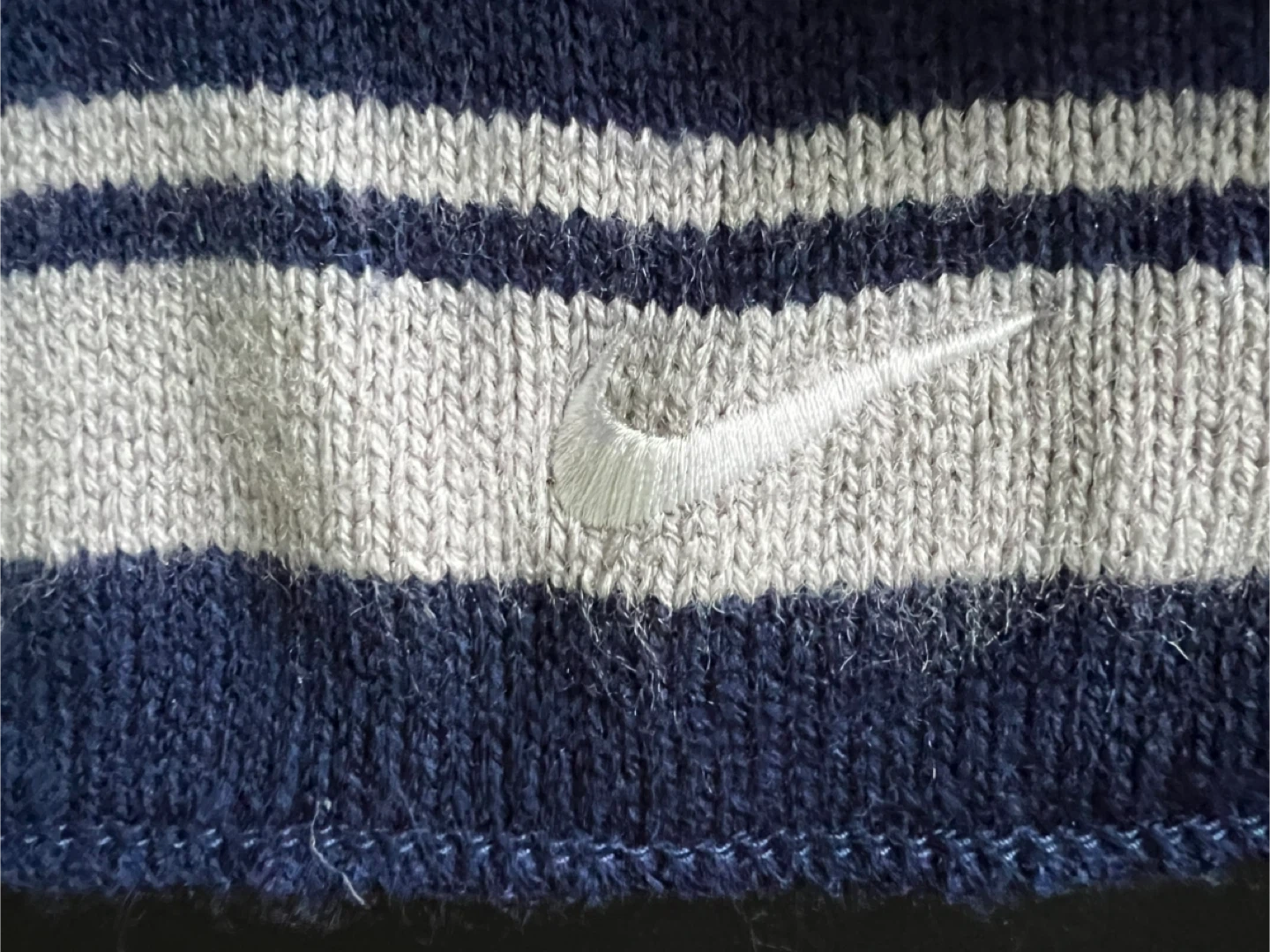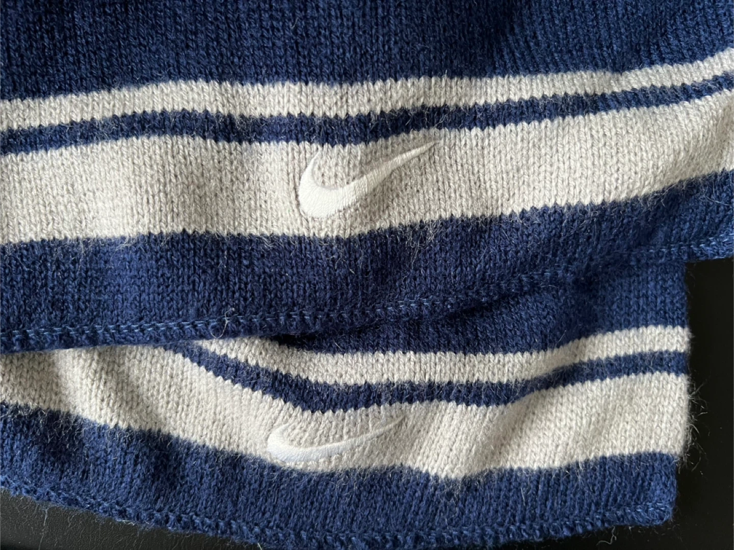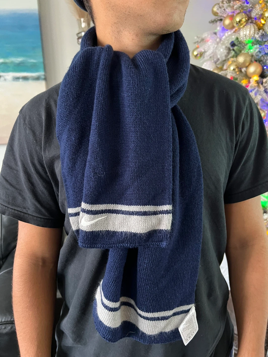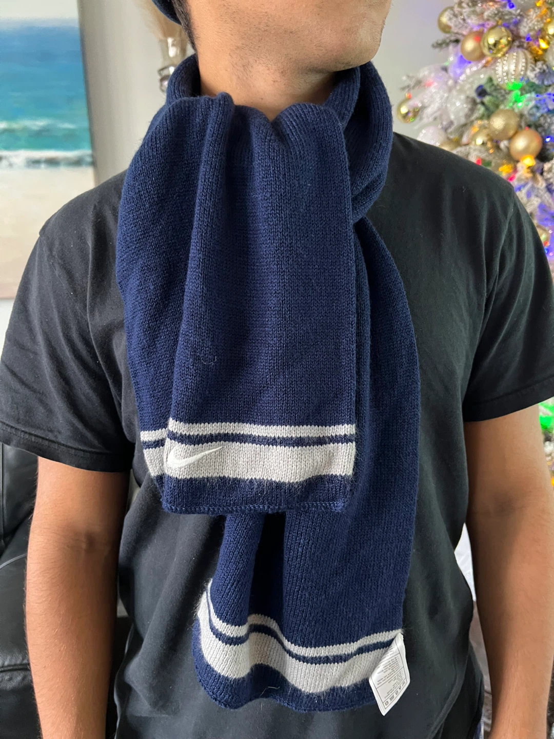 Here's a cozy Nike scarf in navy blue! It's made of 100% acrylic and features the classic Nike logo with white and grey stripes. It's a one-size-fits-all scarf, perfect for keeping warm during the colder months