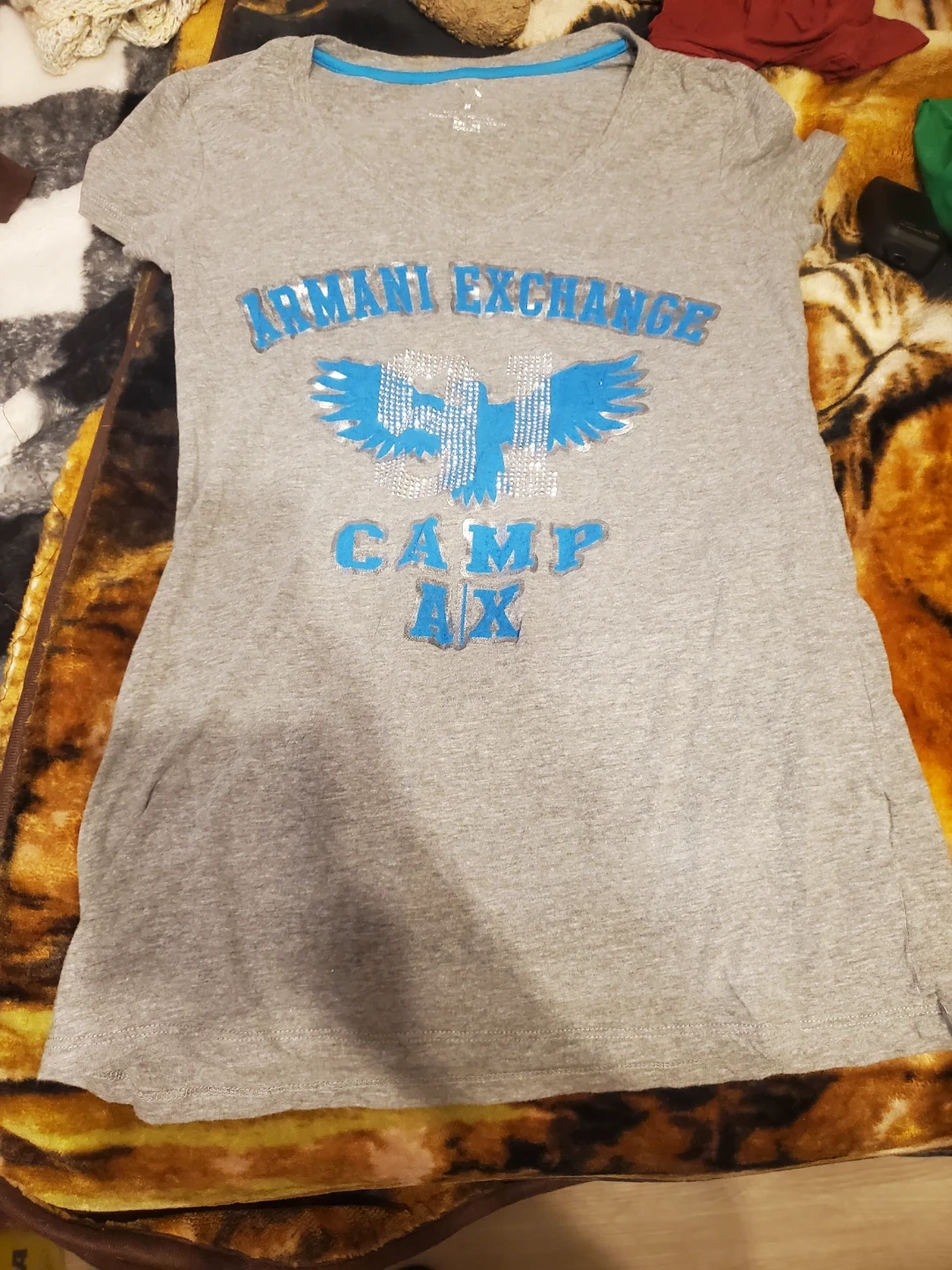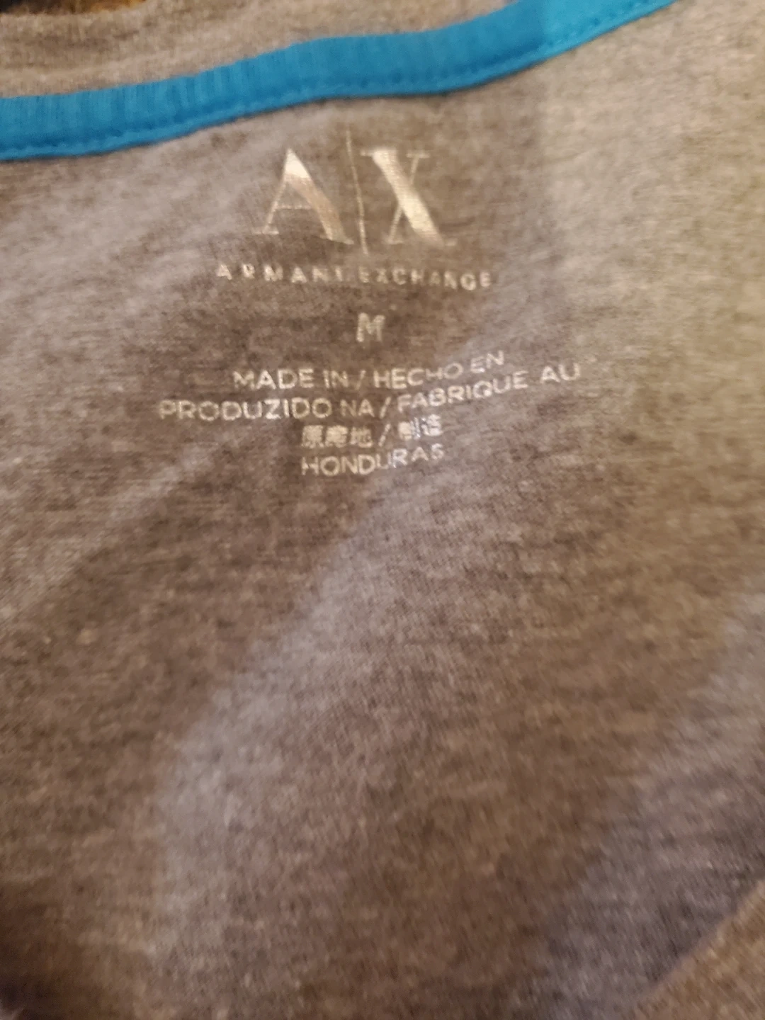Selling an Armani Exchange grey t-shirt in size M. It features a blue Armani Exchange logo design on the front. It's in good condition and ready for a new home!