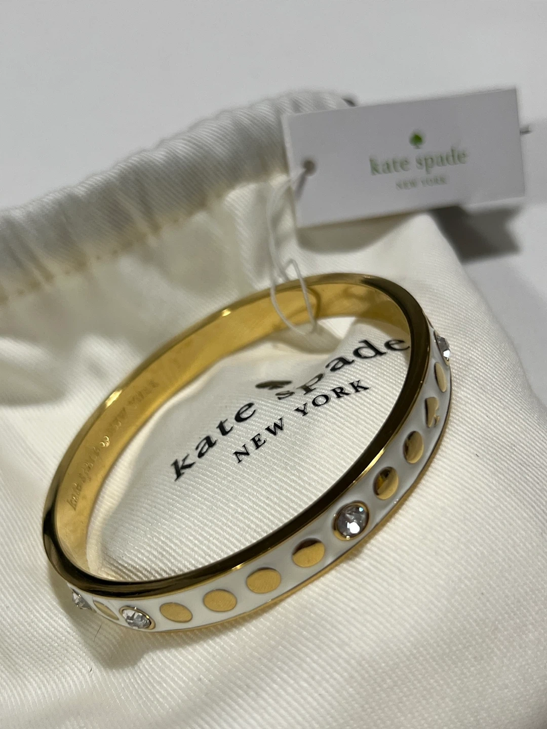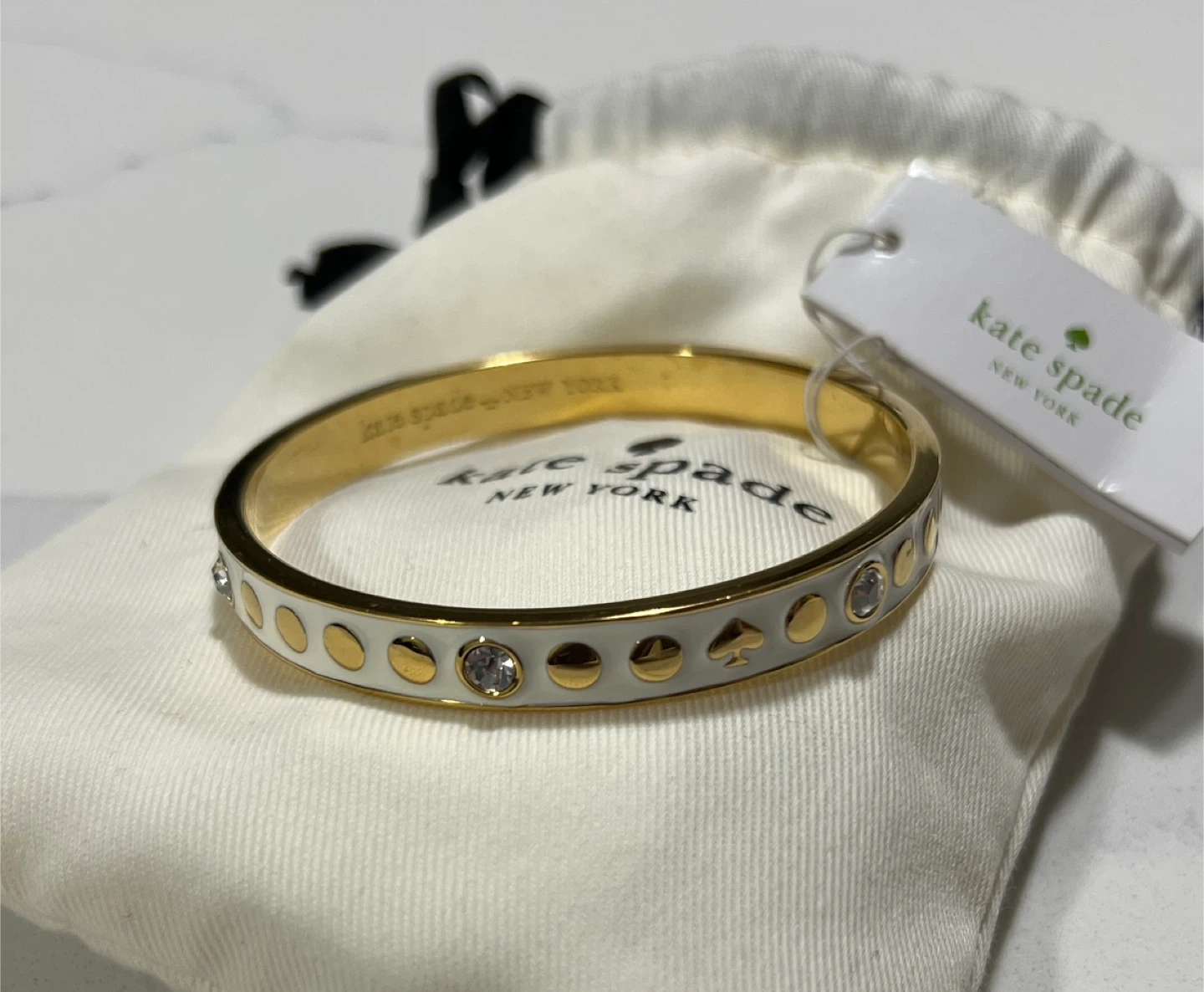 It is a Spot the Spade - Kate Spade New York bangle bracelet. It features a gold and white design with spade accents and embedded clear stones. It's in great condition and comes with its original pouch and tag.