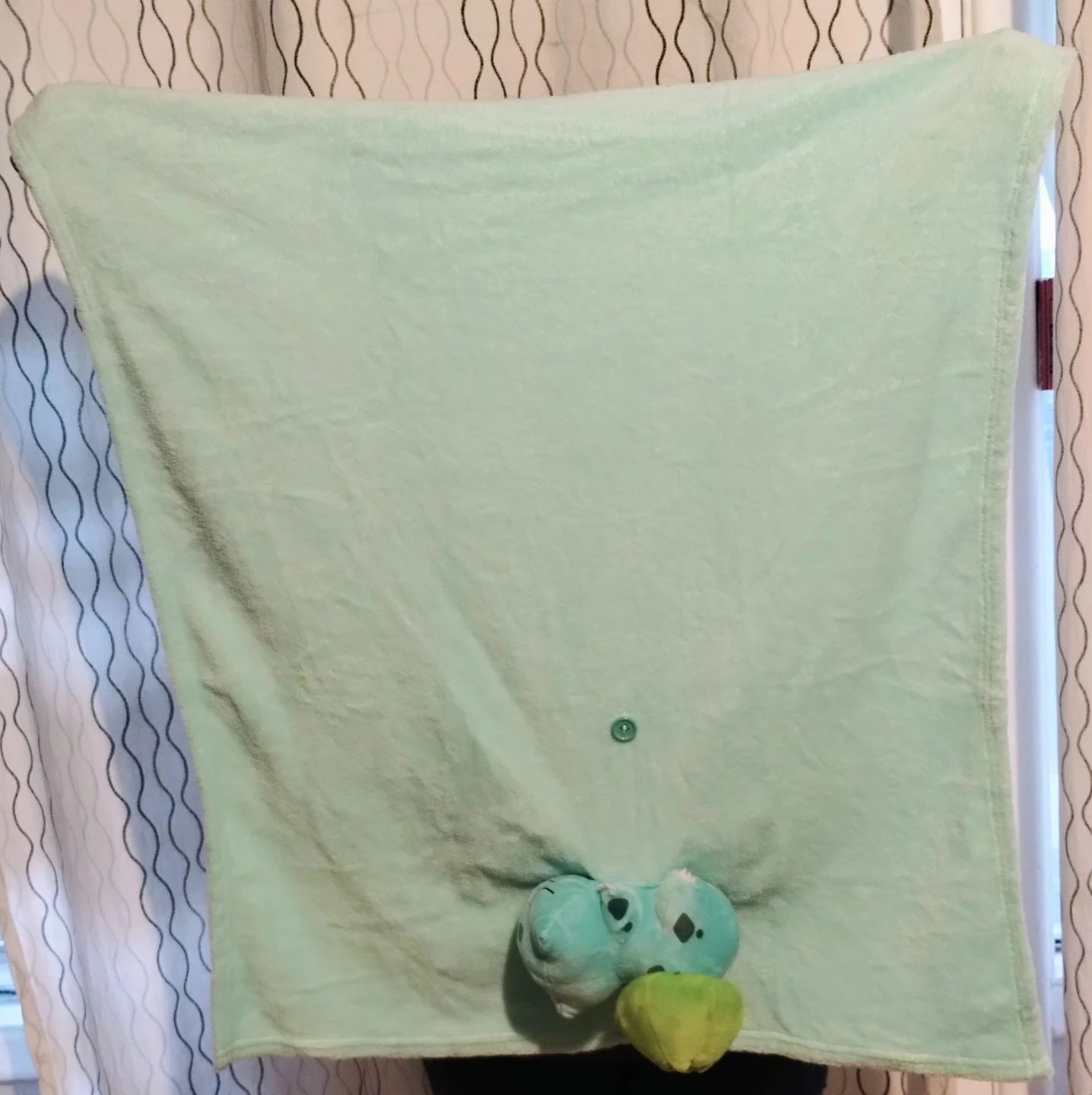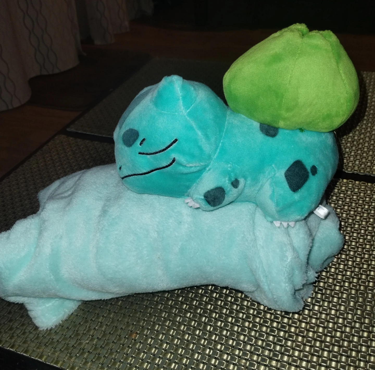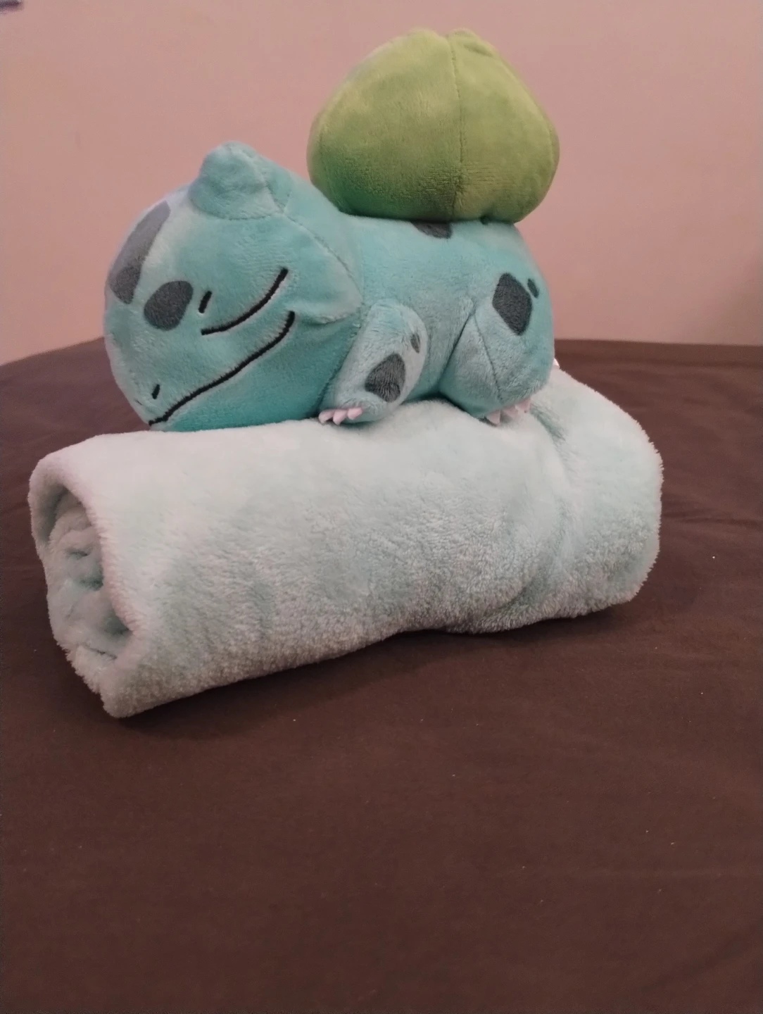 Selling a cute Bulbasaur plushie with a soft, light blue blanket! The blanket measures approximately 32 inches in width. Perfect for any Pokémon fan!