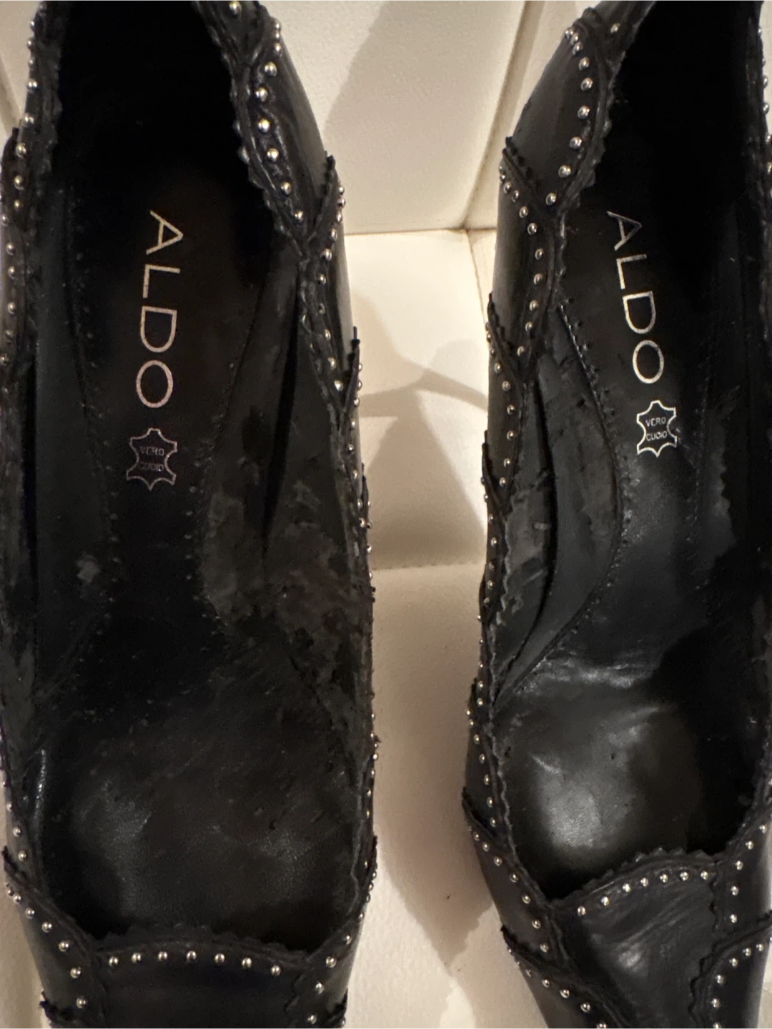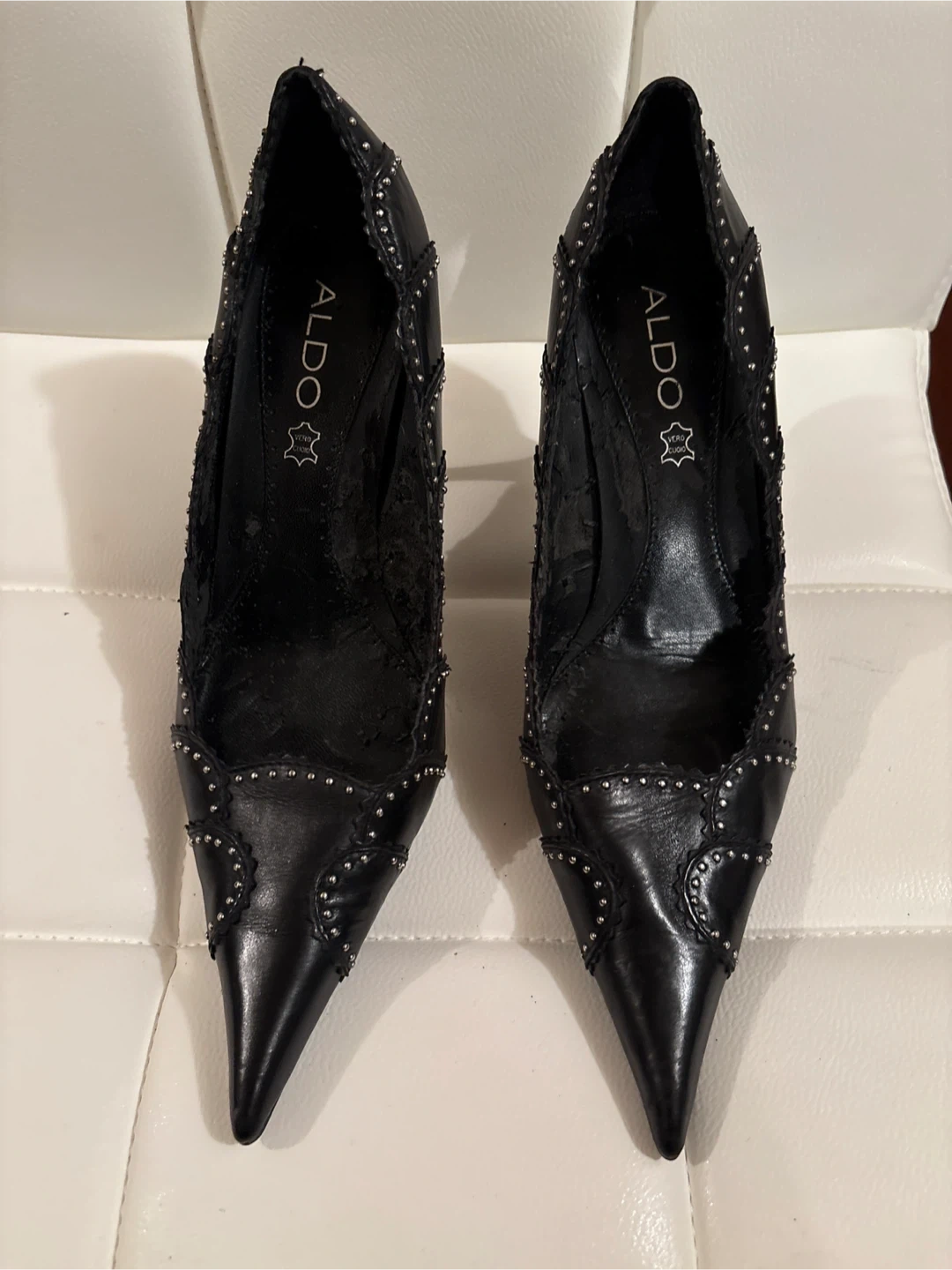 Selling a pair of Aldo black heels with studded detailing. They're in good condition other than somewhere on the inside.