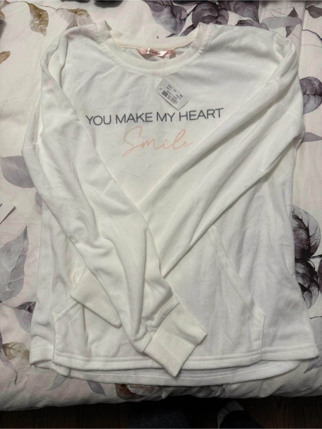 1000+Selling a La Vie en Rose white pullover. It has the words 'YOU MAKE MY HEART Smile' on the front. It's a size XS and in great condition!