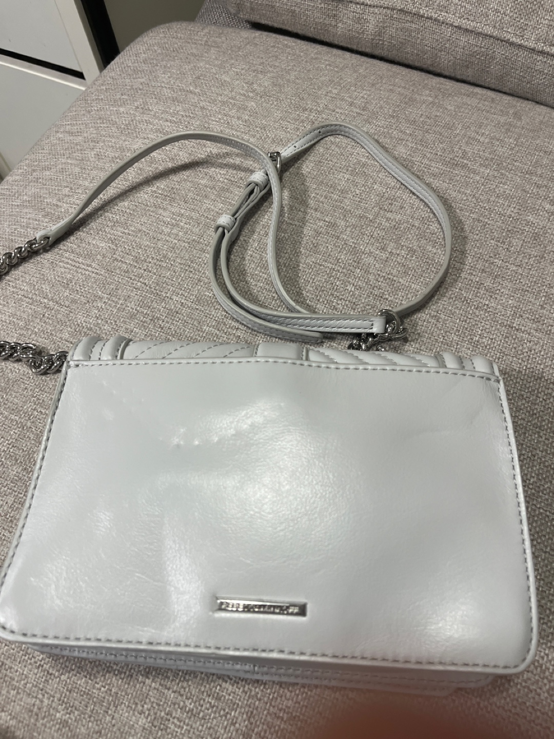 This is a cute Rebecca Minkoff Chevron Quilted Small Love Crossbody bag in grey. It's in great condition and perfect for everyday use or a night out. The quilted design and chain strap add a touch of elegance! It’s very pretty crossbody and look best with a dress. Only used 1-2 times. 100 obo and pick up at Thornhill. Originally from Northdrom for around 300.
