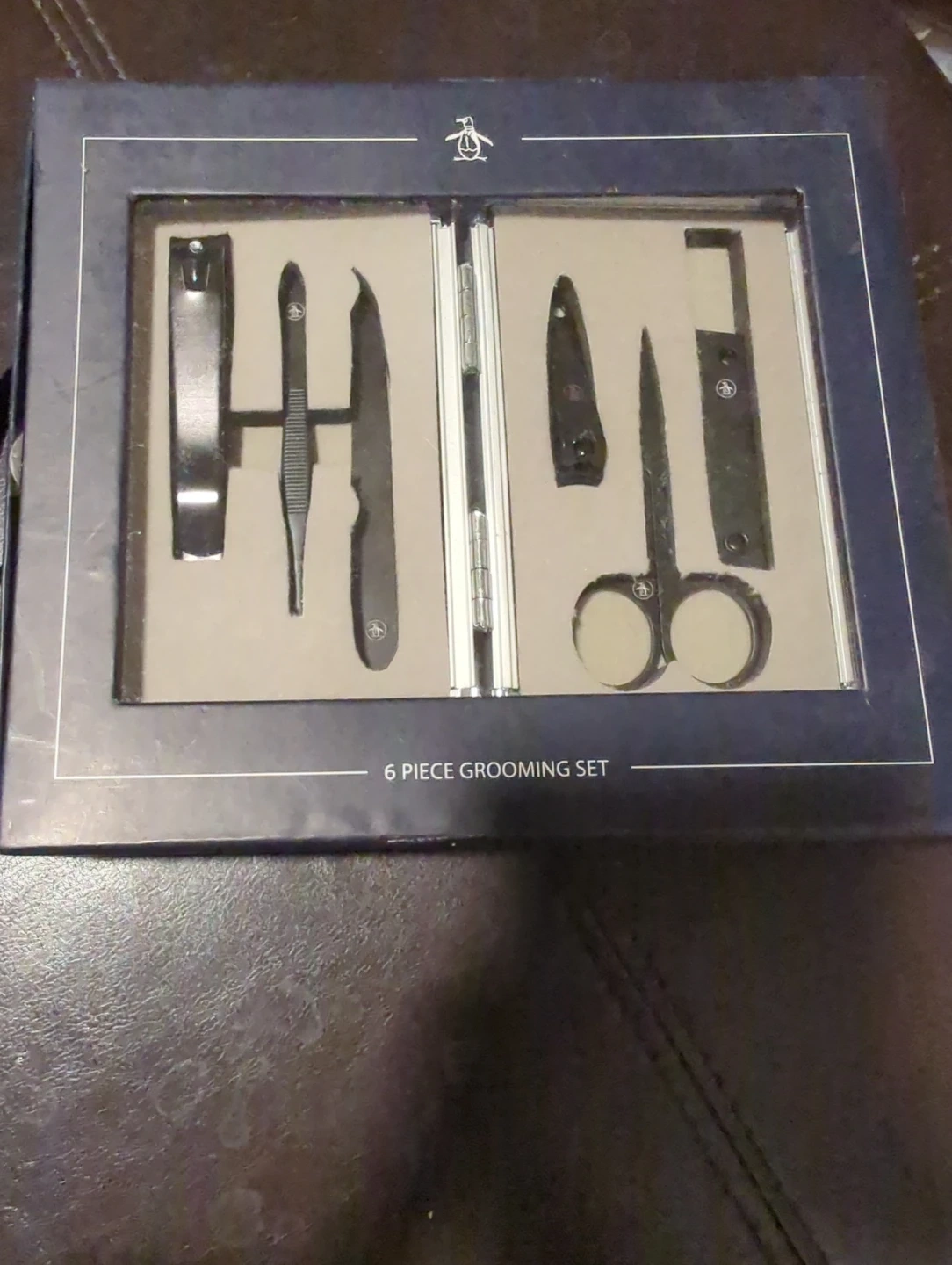 Selling an Original Penguin 6-piece grooming kit set! It includes small and large nail clippers, tweezers, mini multi-tool, nail file, scissors, and a durable hard case. Perfect for keeping your grooming essentials organized at home or while travelling