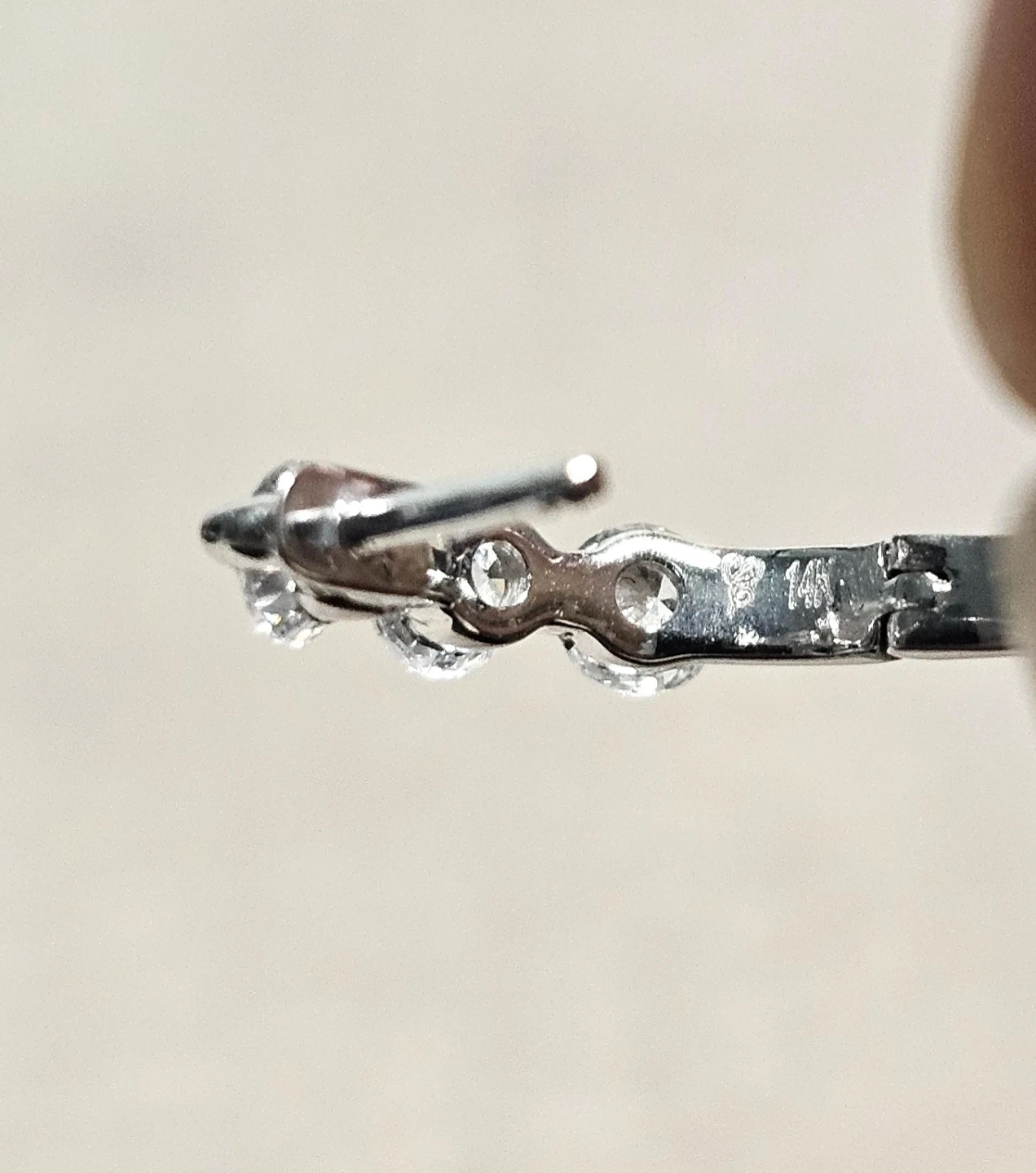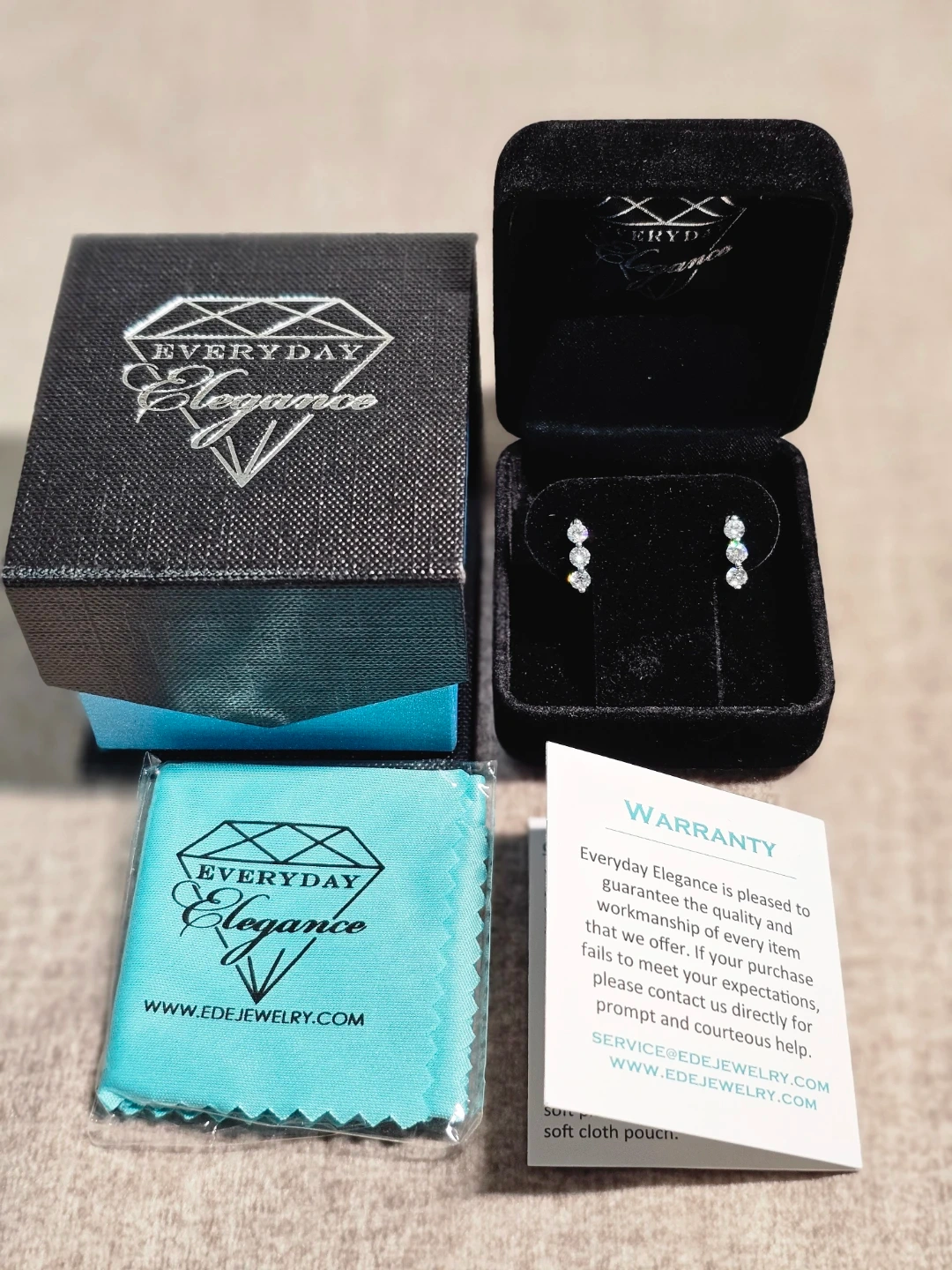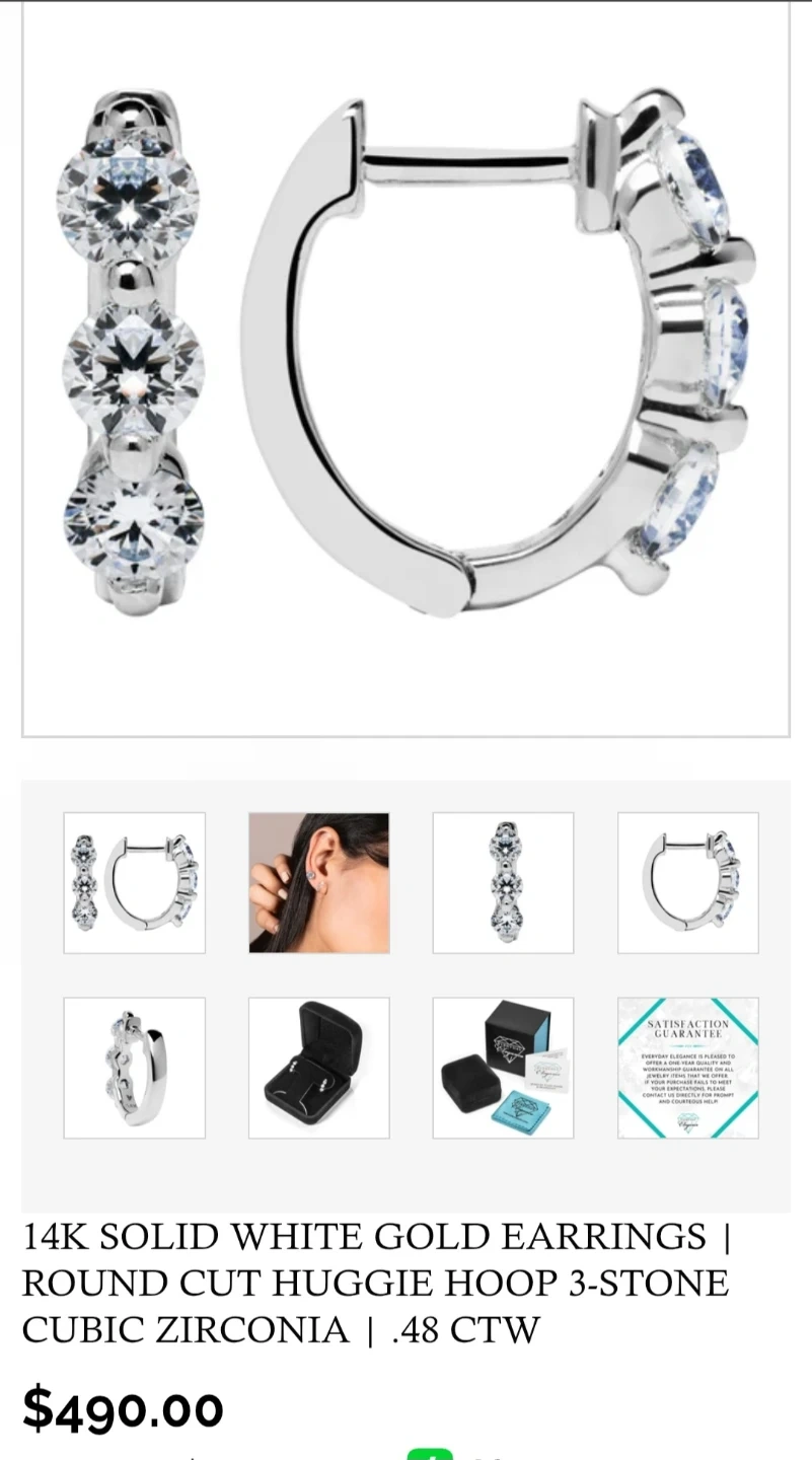 These are a beautiful pair of Everyday Elegance 14K solid white gold earrings. They feature a round cut huggie hoop design with 3-stone cubic zirconia. These earrings are .48 CTW and originally price for $490.
