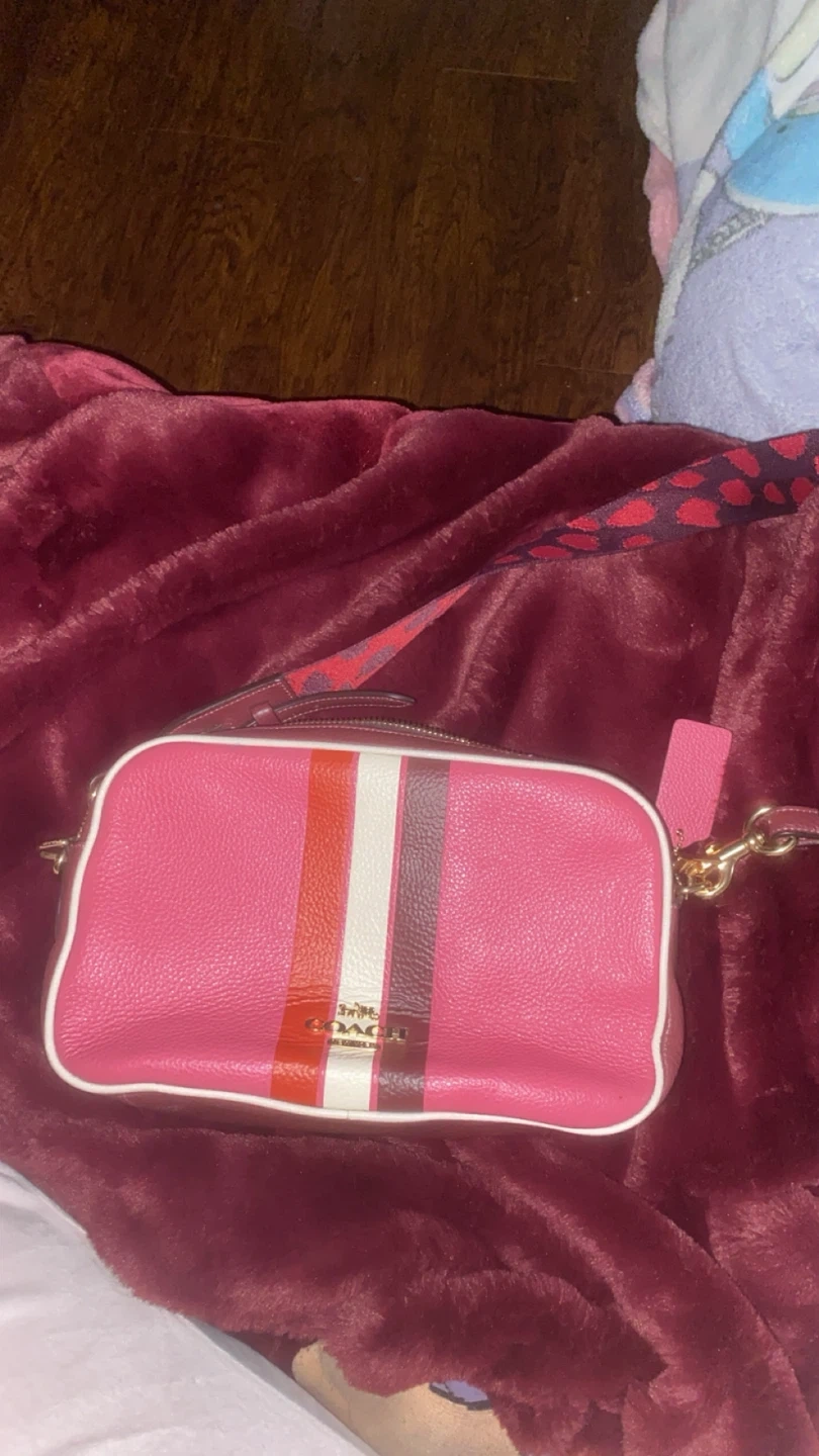 Selling a cute Coach crossbody bag in pink! It's in good condition and has a stylish design with a stripe detail. Perfect for carrying your essentials while adding a pop of colour to your outfit