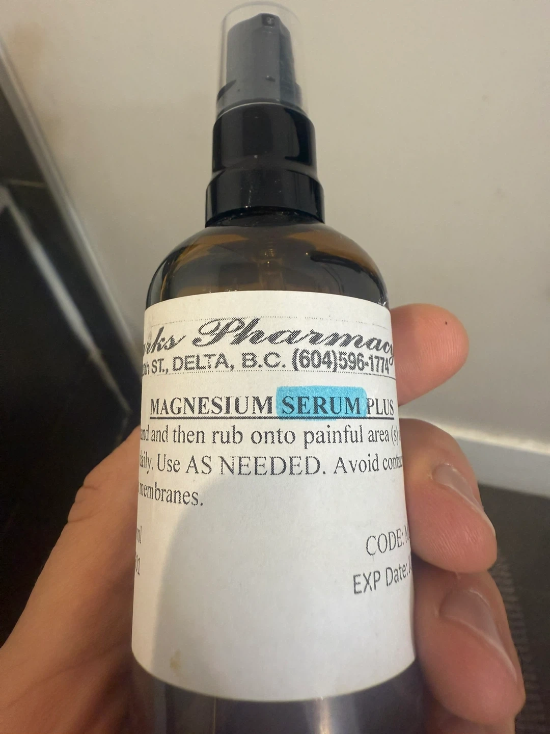 Selling a bottle of Marks Pharmacy Magnesium Serum Plus. It's a 100ml bottle, and the expiration date is July 2026. Ingredients include Magnesium Chloride, MSM, and DMSO