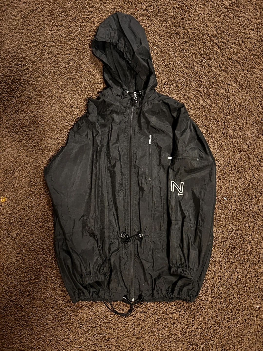 Selling a black Nike windbreaker jacket. It has a hood and a drawstring at the waist. The Nike logo is on the sleeve. It's in good condition and ready for a new home!