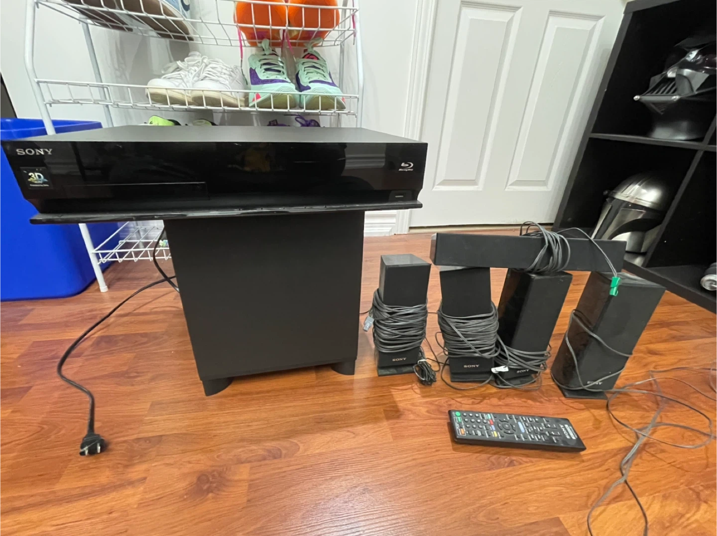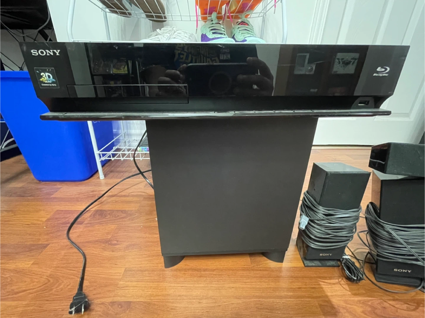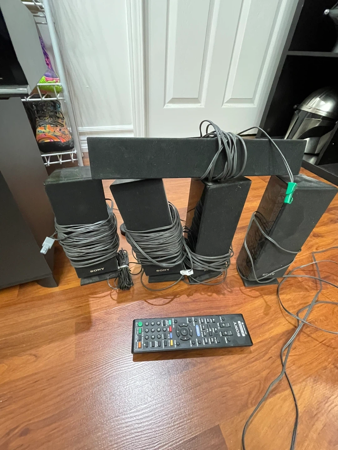 Selling a Sony 3D Blu-ray Disc Home Theatre System. It includes the main unit, subwoofer, speakers, and remote control. Perfect for creating a home theatre experience!