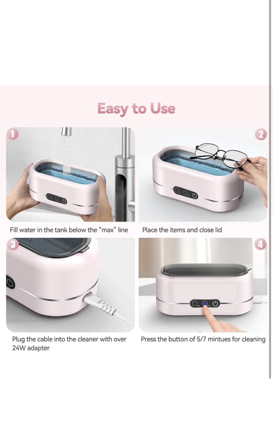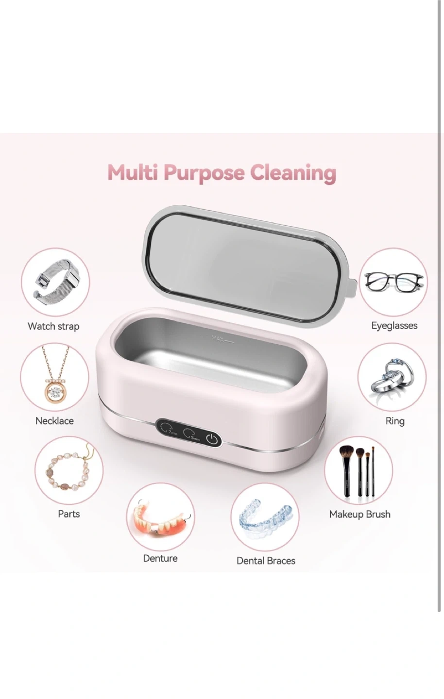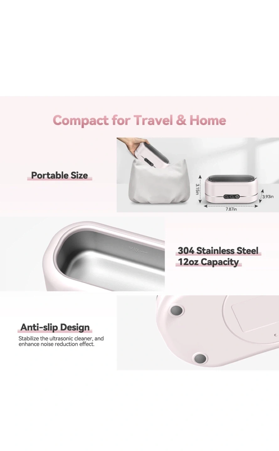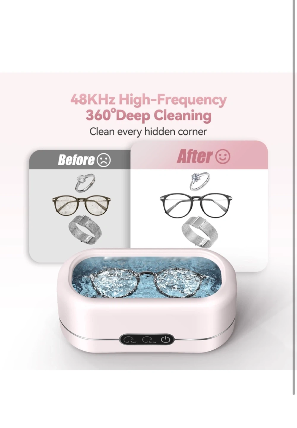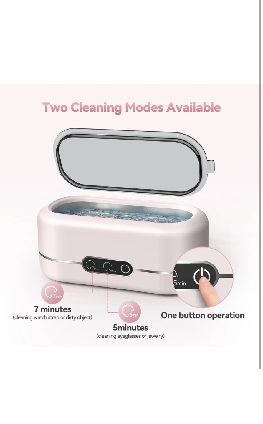 Keep your valuables sparkling with this ultrasonic cleaner! It uses high-frequency 48KHz sound waves for a deep 360° clean, reaching every hidden corner. Easy to use with one-button operation and two cleaning modes: 5 minutes for eyeglasses or jewelry, and 7 minutes for watch straps or dirty objects