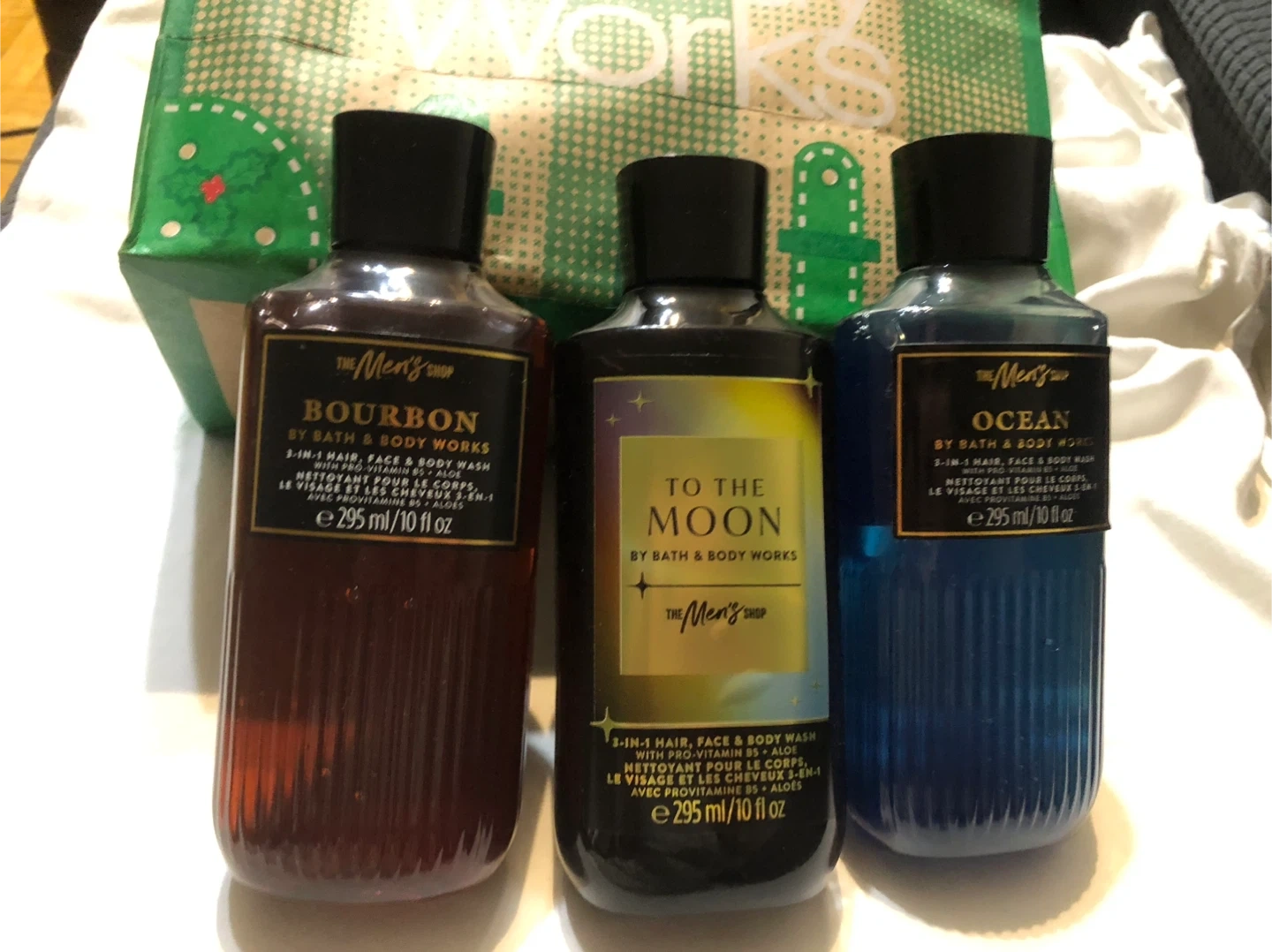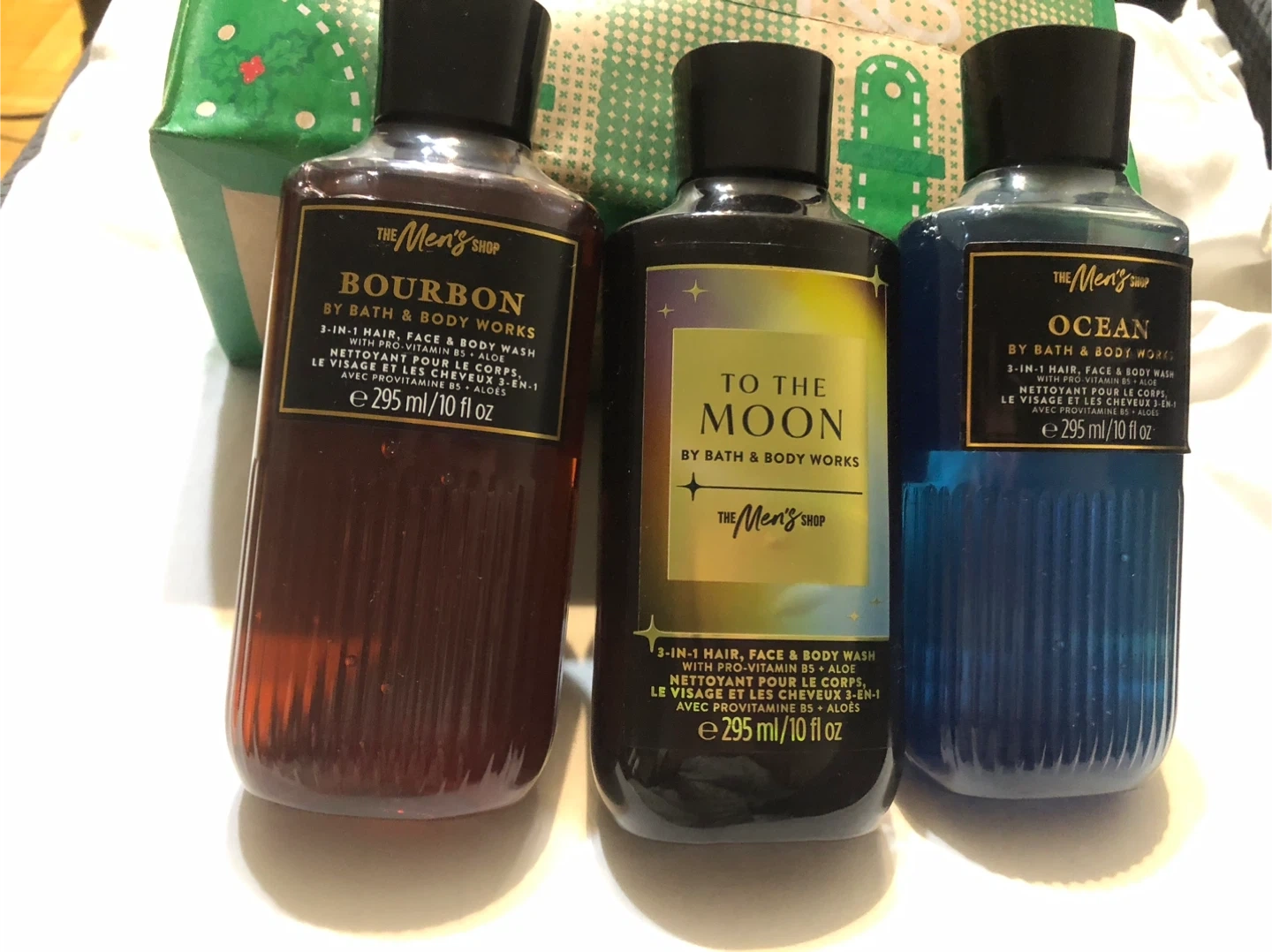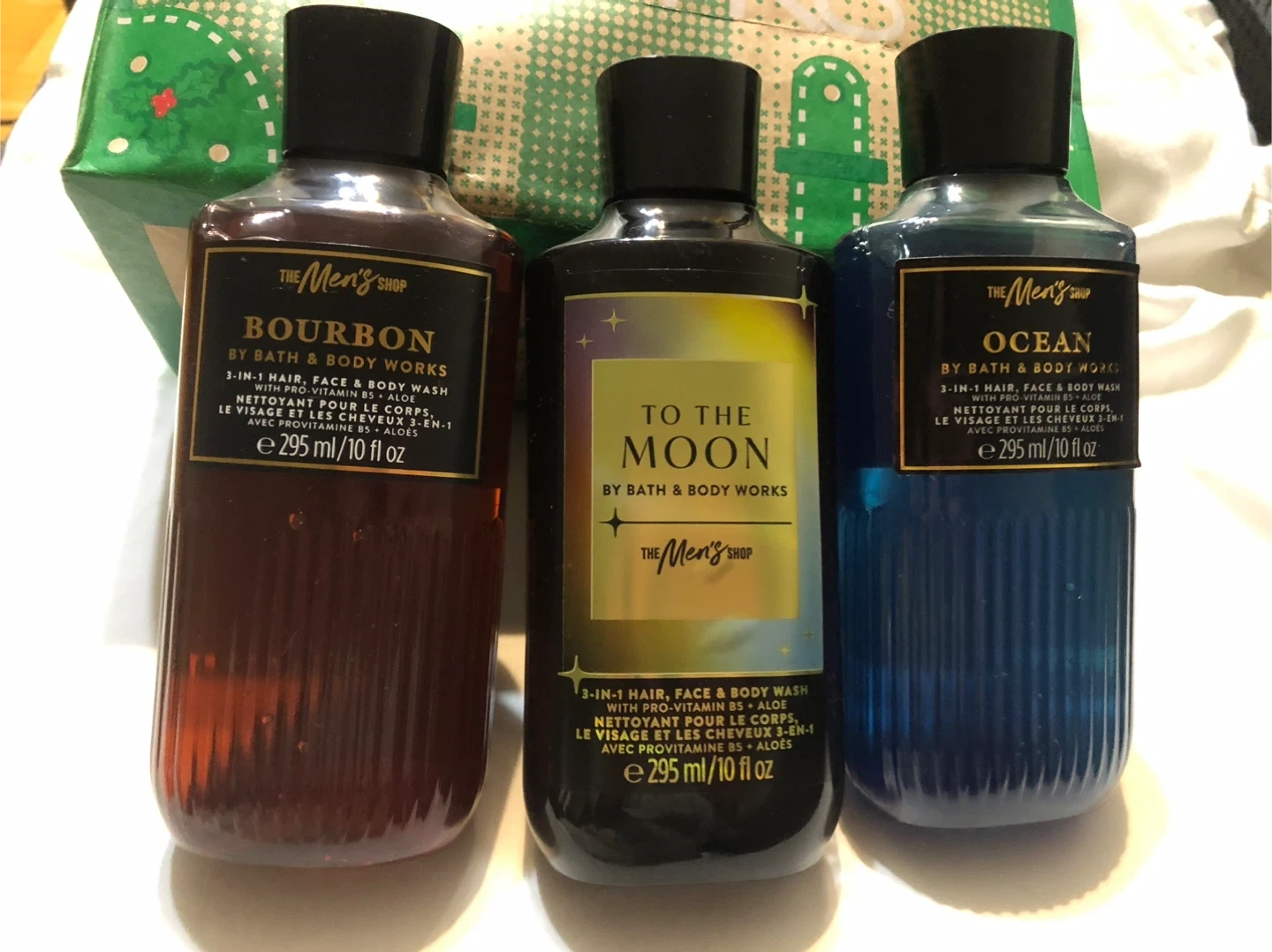 153Selling a set of three Bath & Body Works Men's Shop 3-in-1 hair, face, and body washes. The set includes Bourbon, To The Moon, and Ocean scents. Each bottle contains 295 ml / 10 fl oz. Pick up at Islington /401 / bergamot avenue Etobicoke . I accept Cash only. If you see the add up it’s available. 🔷PLEASE CHECK OUT OUR OTHER LISTINGS TOO🔷