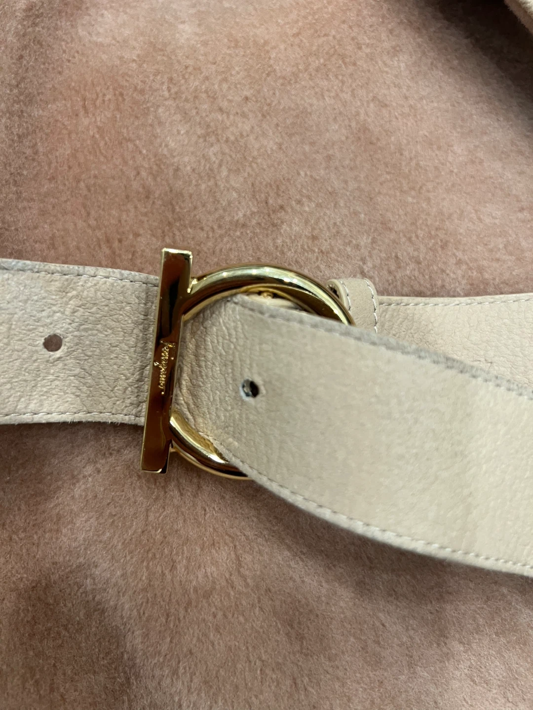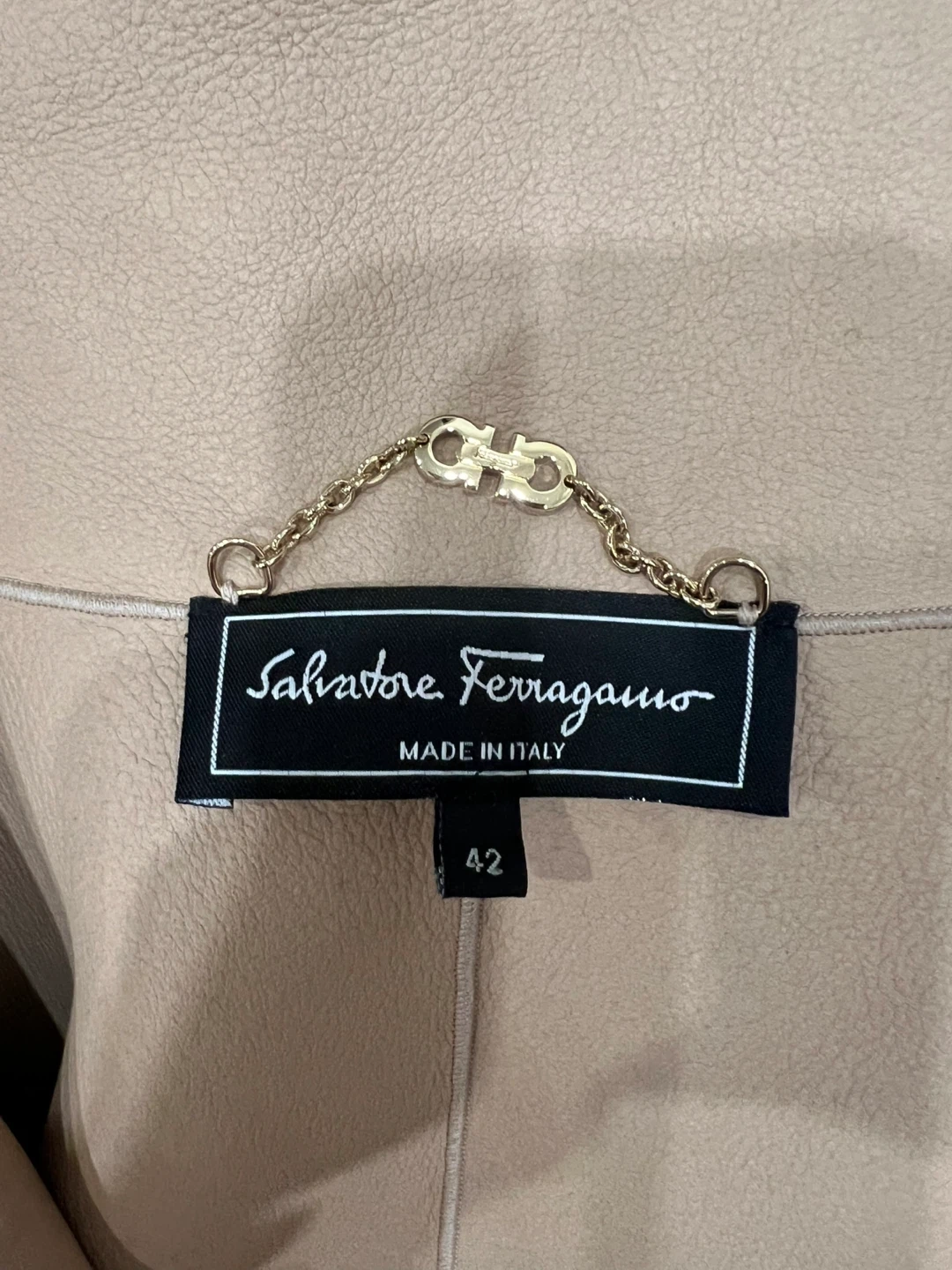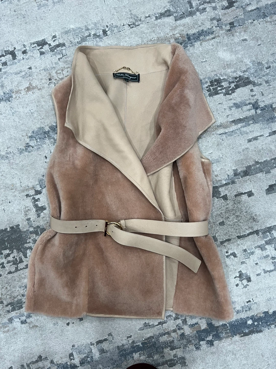Here's a stylish Salvatore Ferragamo vest made from lamb's shearling! It's a beautiful beige/light brown colour and comes with a belt. The size is 42. The fur origin is Portugal. It's in great condition! Never worn.