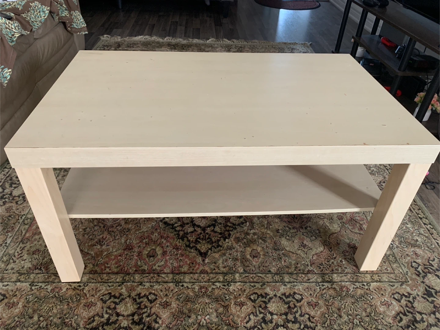Selling an IKEA Lack coffee table in beige. It has a simple and clean design that fits well in any living room. It's sturdy and has a convenient shelf underneath for storage