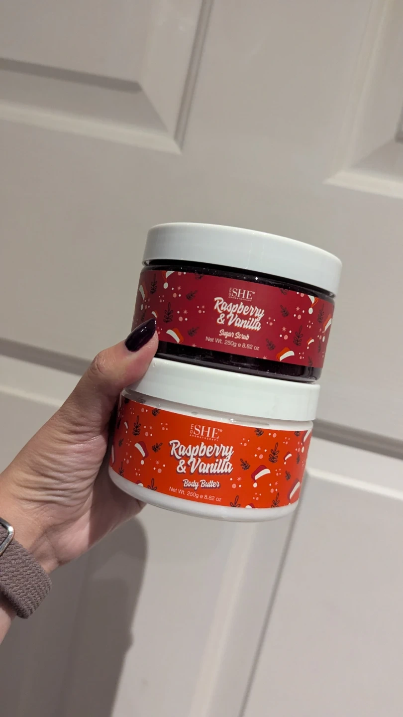 Selling a set of Om Aromatherapy Raspberry & Vanilla products! You'll get both the sugar scrub and the body butter. Each container has a net weight of 250g (8.82 oz). Perfect as a Christmas gift. Take one for 5 or both for 8.