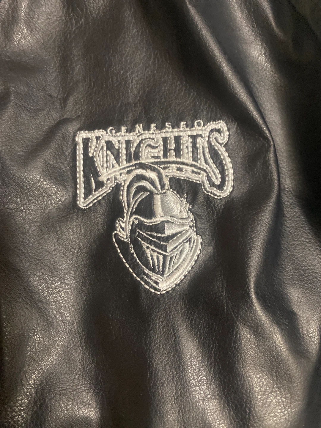 Selling a Geneseo Knights varsity jacket in black and grey. It's in great condition and features the Knights logo on the front and back. Perfect for any Geneseo fan!