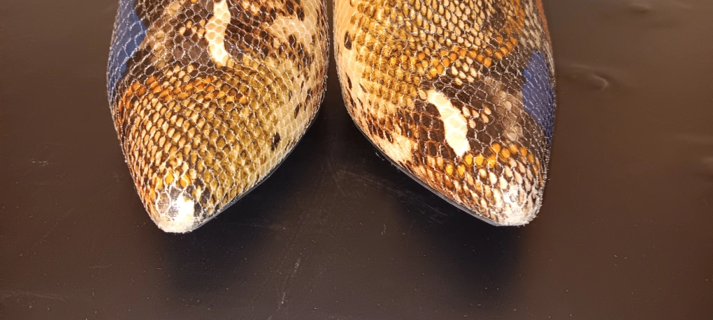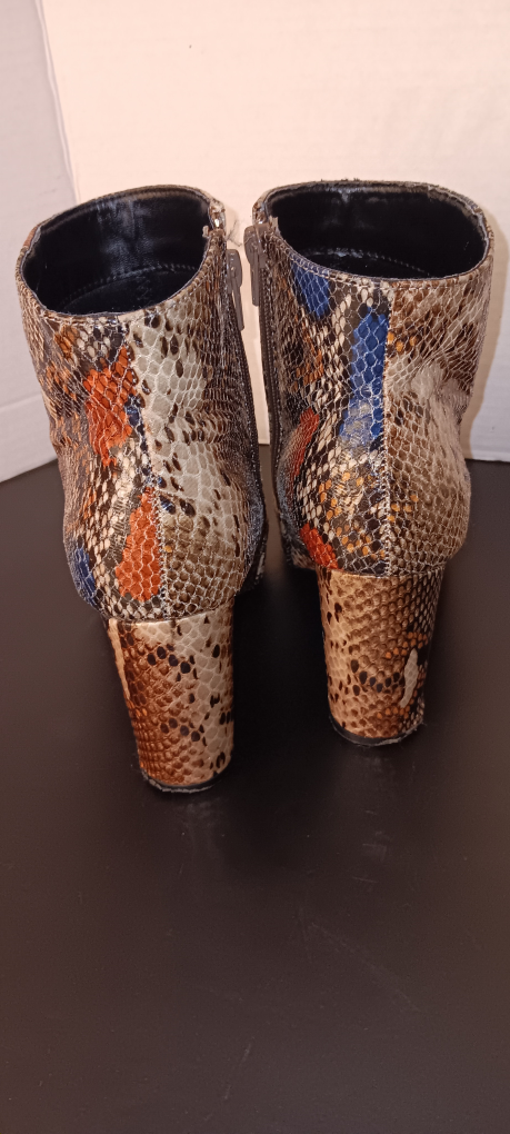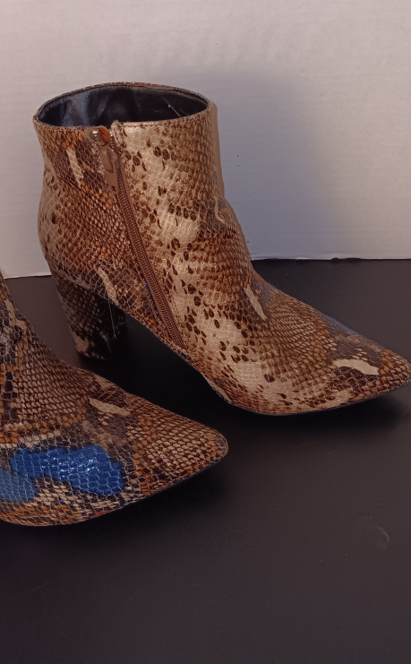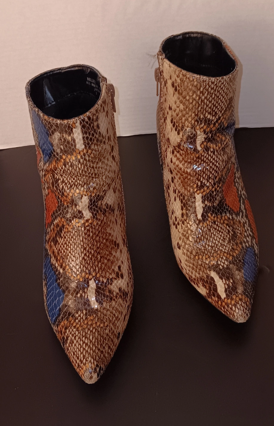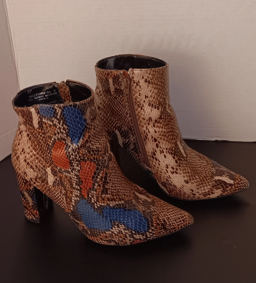 These Bellflower ankle booties feature a stylish snakeskin print with accents of blue and orange. They have a zip closure and are in good condition, ready to add a fashionable touch to your wardrobe! some wear on the toes. Adorable!!!